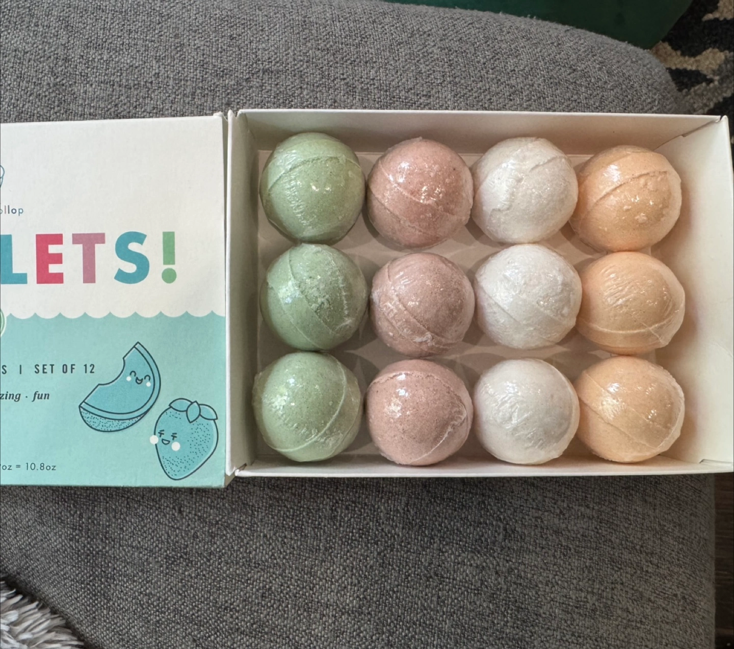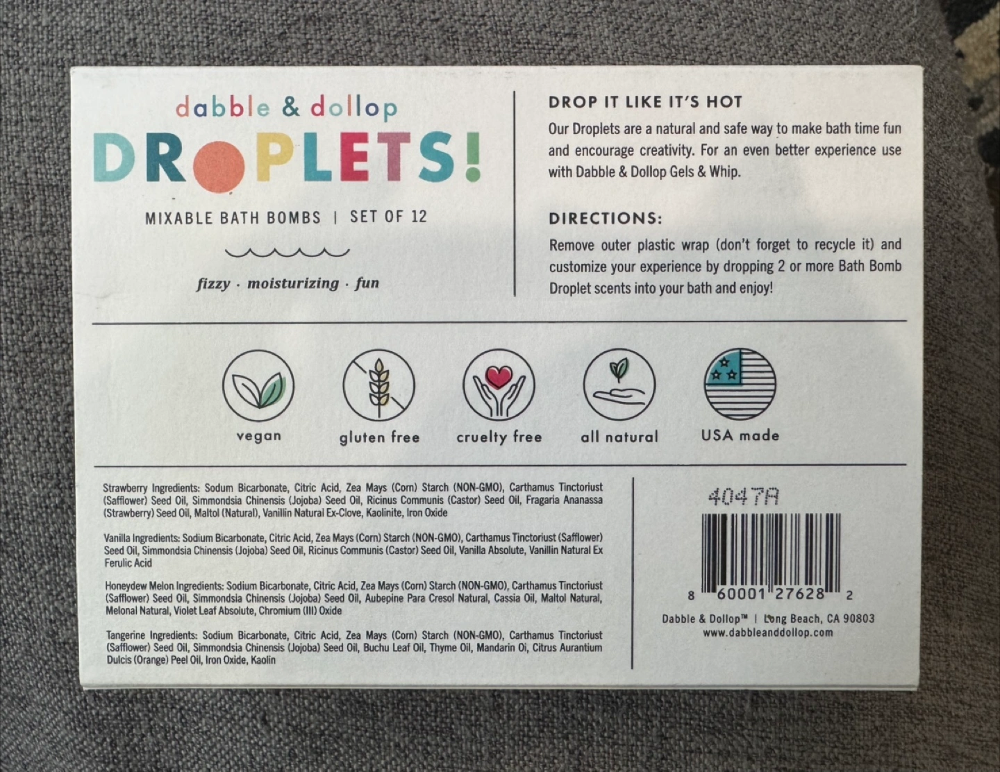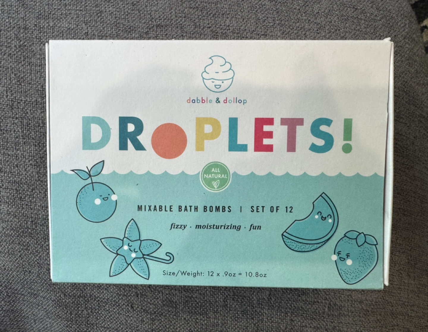 These Dabble & Dollop Droplets are a set of 12 mixable bath bombs that are kid-safe. They're all natural, vegan, gluten-free, cruelty-free, and made in the USA. Each bath bomb is individually wrapped, so you can customize your bath experience by dropping in 2 or more scents!