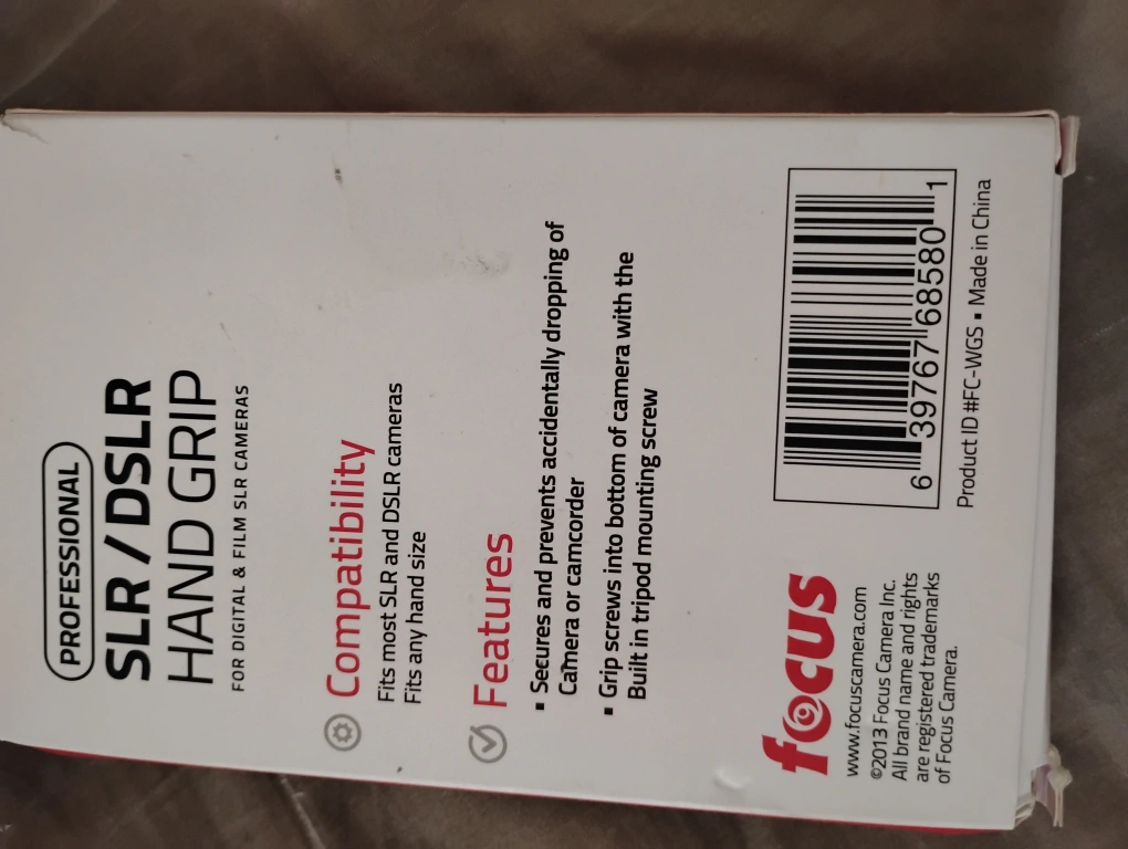 Selling a Focus SLR/DSLR Pro Hand Grip. It fits most SLR and DSLR cameras of any size. Features include securing and preventing accidental dropping of your camera or camcorder. It also grips screws into the bottom of the camera with a built-in tripod mounting screw
