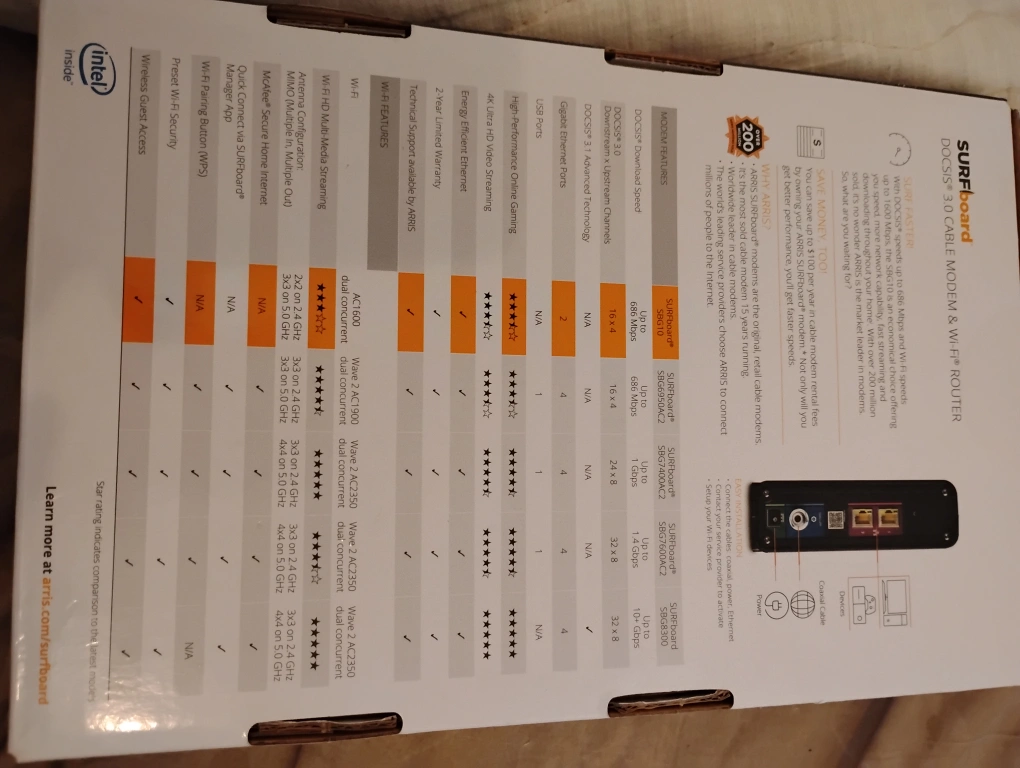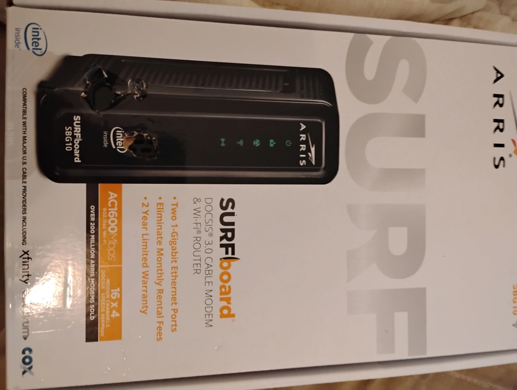 Selling an ARRIS SURFboard SBG10 DOCSIS 3.0 cable modem and WiFi router! It supports up to 686 Mbps and WiFi speeds. It's compatible with major U.S. cable providers, including Xfinity. Key features include: - Two 1-Gigabit Ethernet ports - Eliminate monthly rental fees - 2-year limited warranty