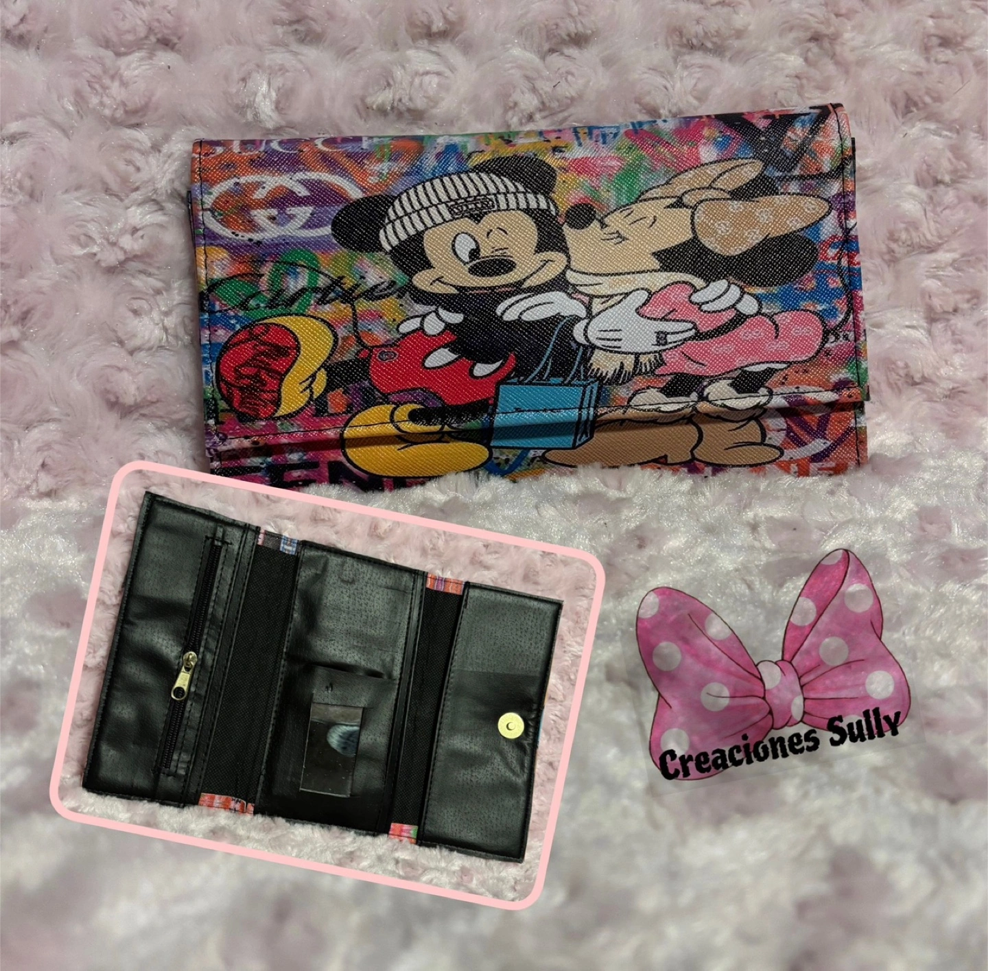 Cute Disney wallet featuring Mickey and Minnie Mouse! It has a colorful design on the outside and a black interior with a zipper compartment