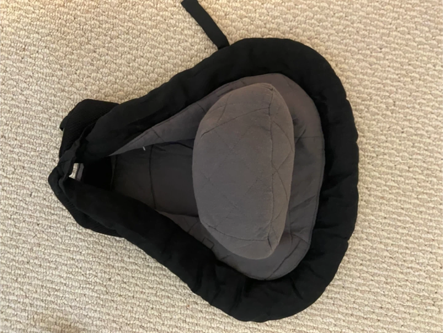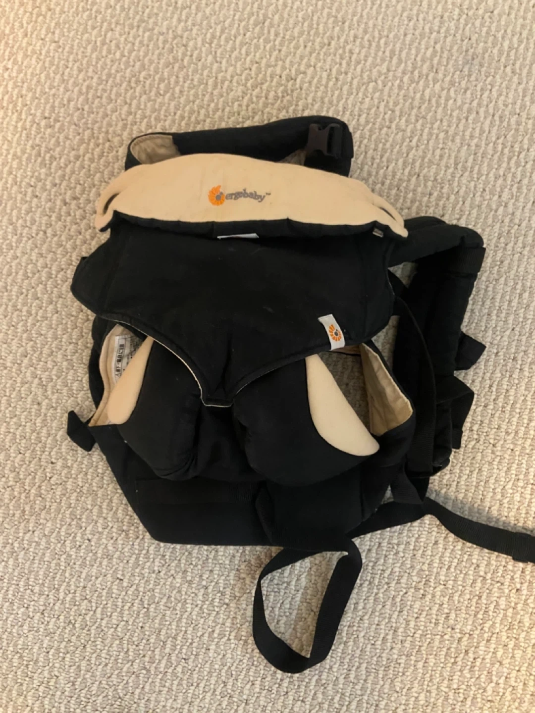 This is an Ergobaby baby carrier in black and tan. It has a padded waistband and shoulder straps for comfort. The carrier is adjustable for different baby sizes. Comes with newborn insert/