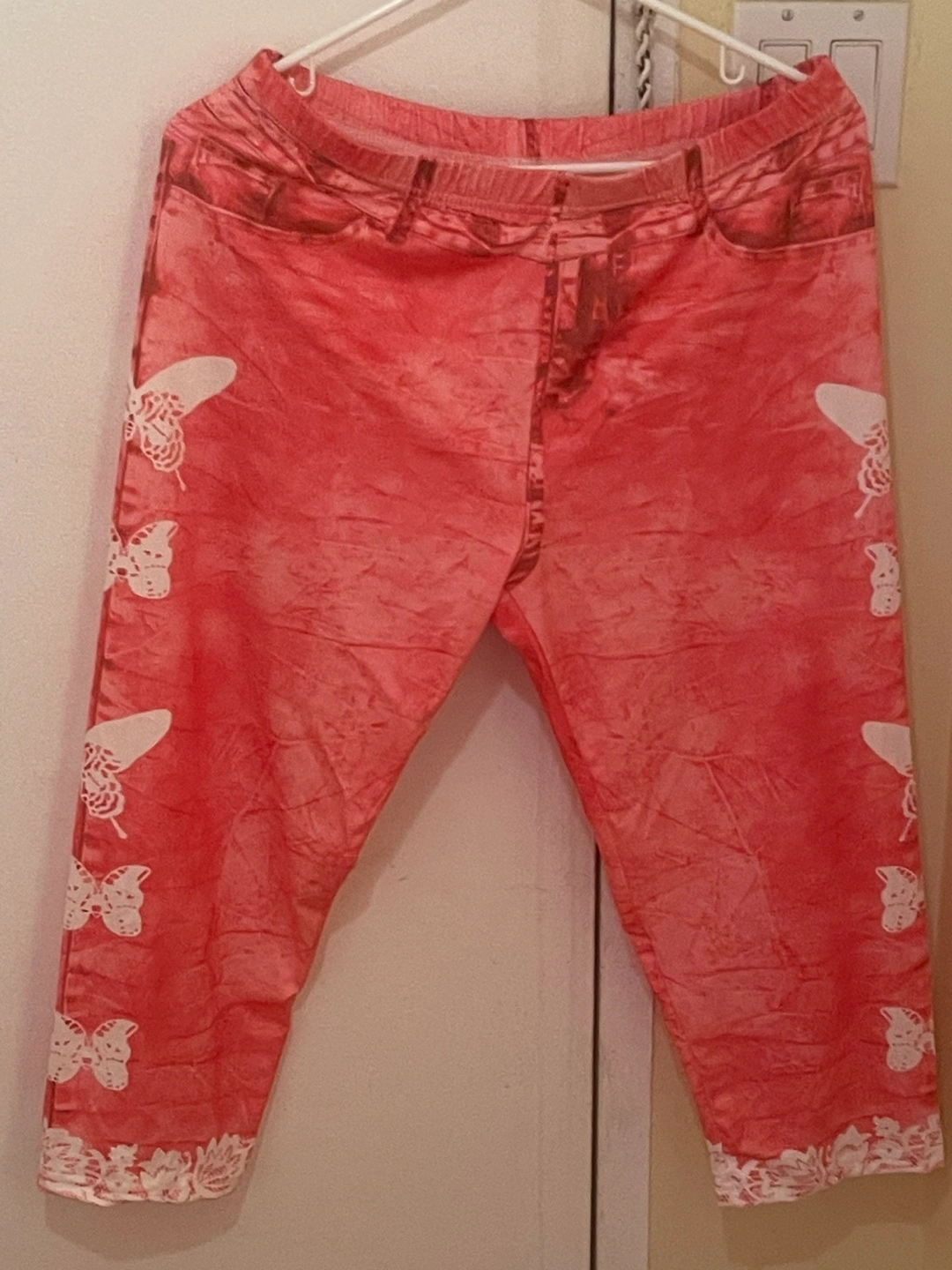 Cute pink capri pants with a butterfly design! They're perfect for warm weather and casual wear. The elastic waistband makes them super comfy too size xl. Price $10 negotiable