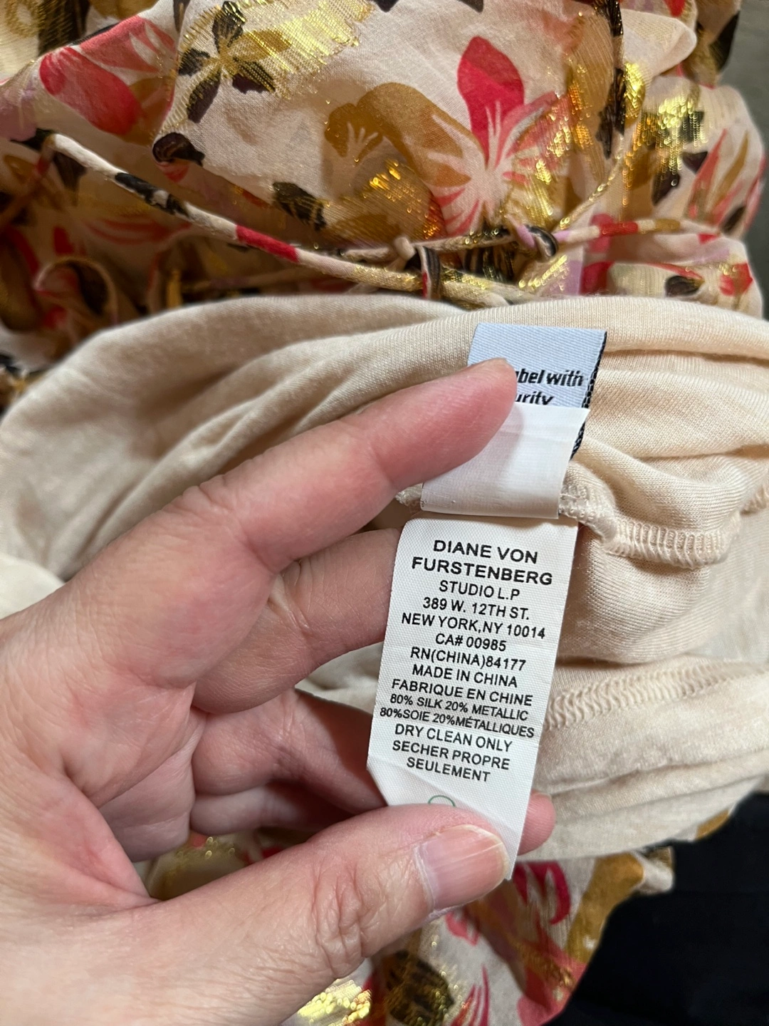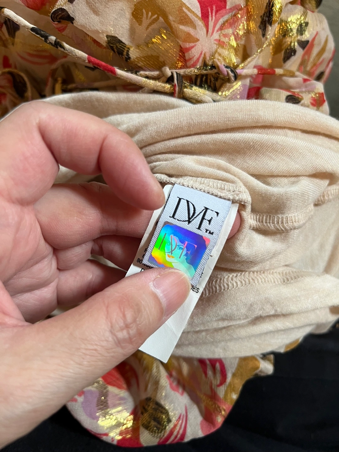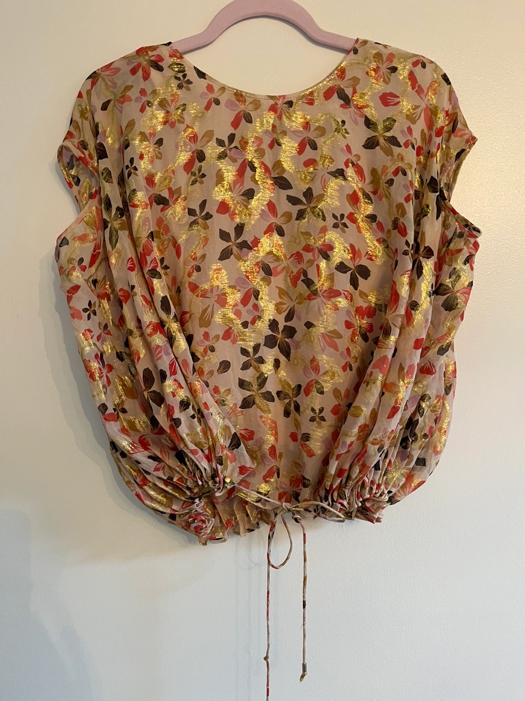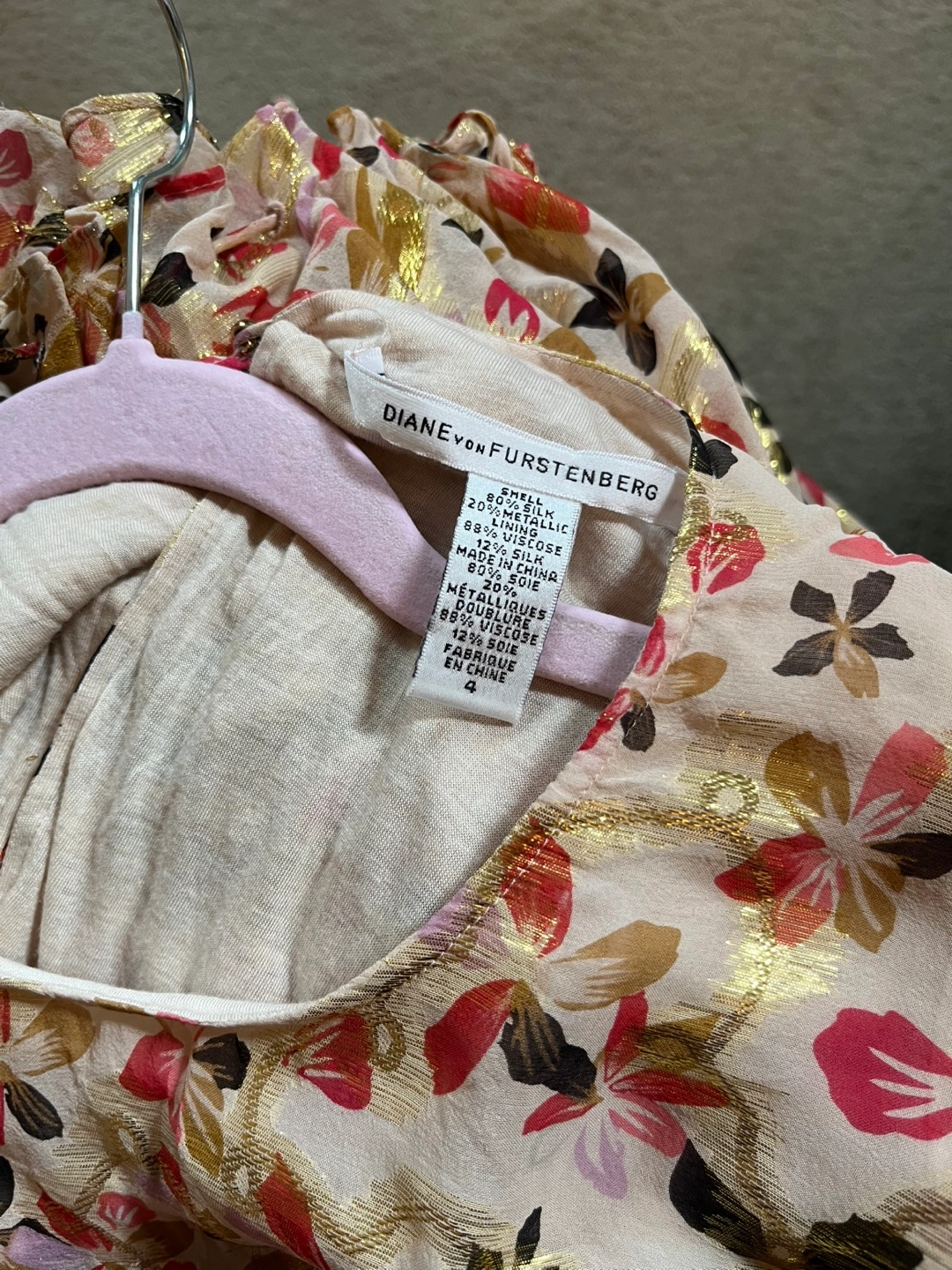 Selling a beautiful Diane von Furstenberg blouse in size 4! The blouse features a lovely floral pattern with metallic threads.