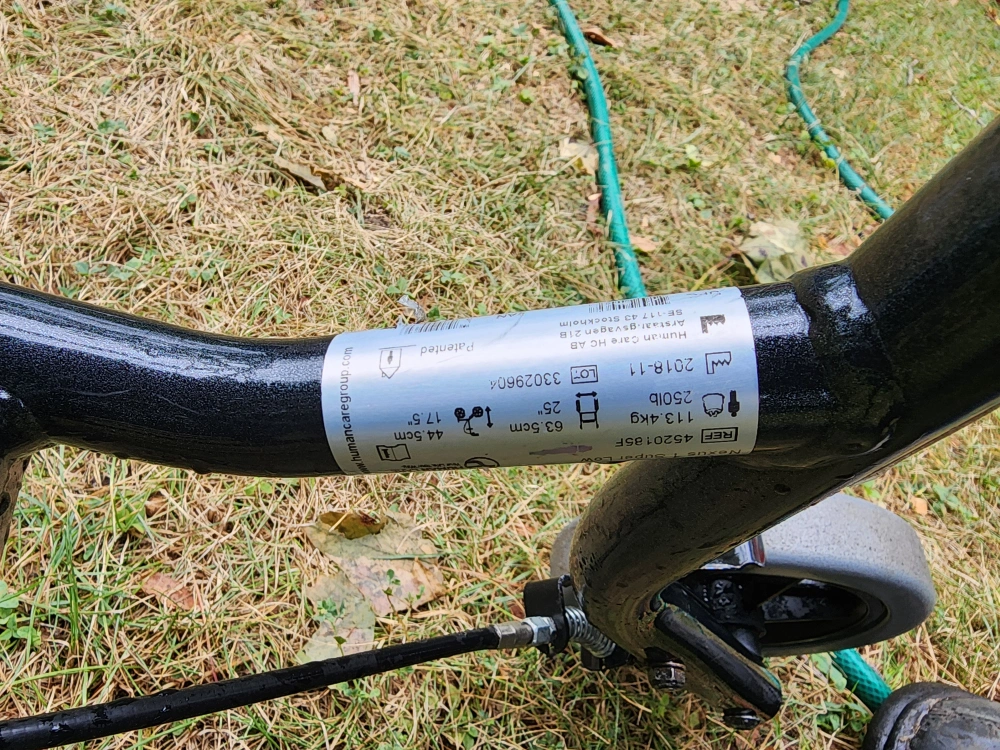 Here's a Humanacare rollator walker in good condition. It can support up to 250 lb. It measures 25 inches in length and 17.5 inches in width. Manufactured in 2018 November.
