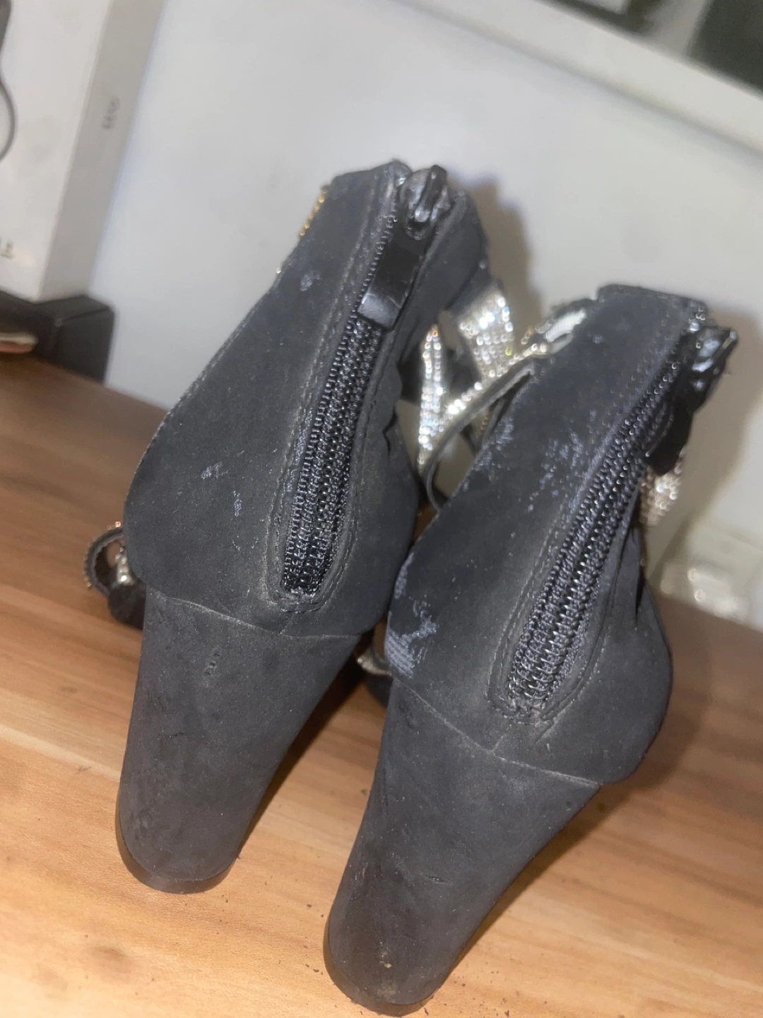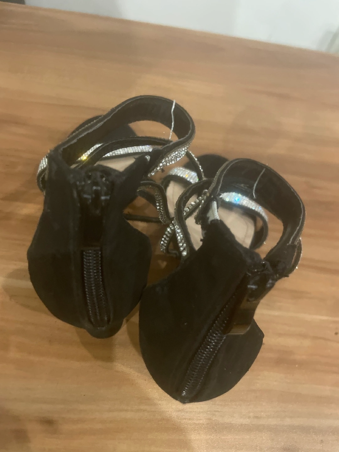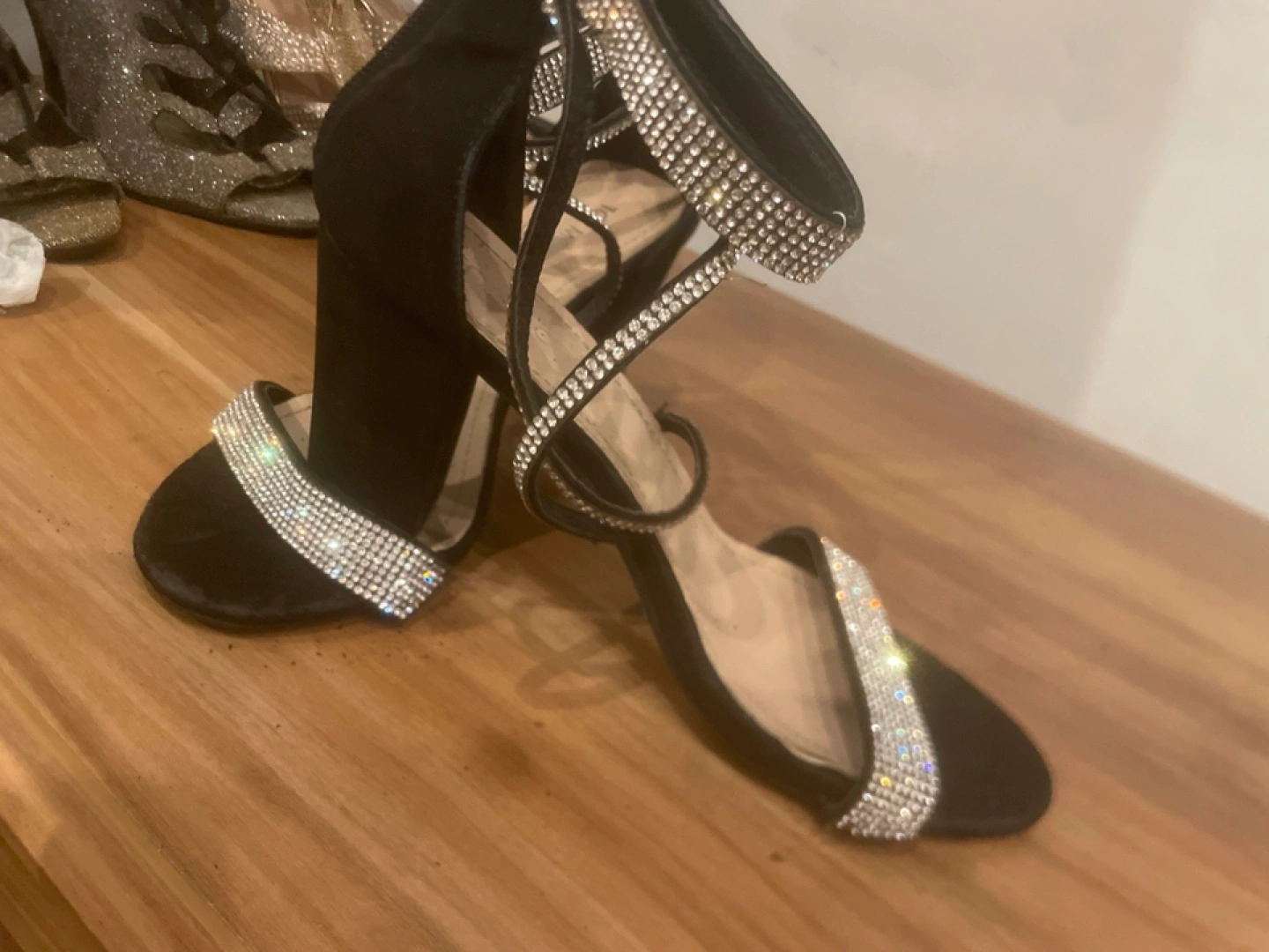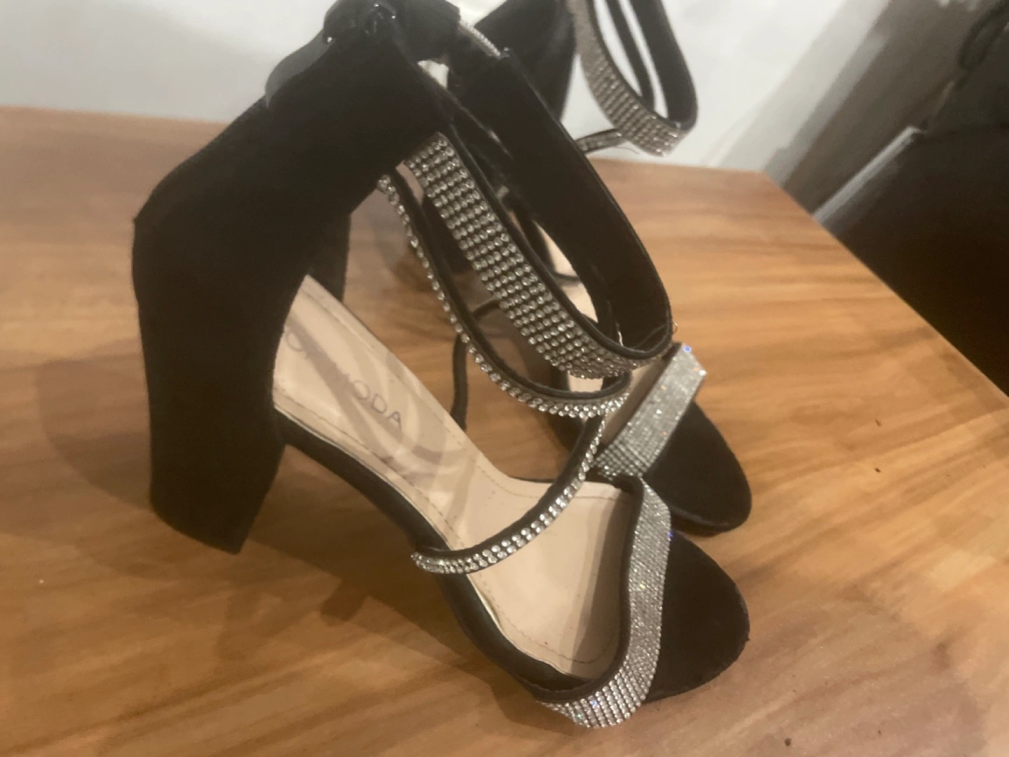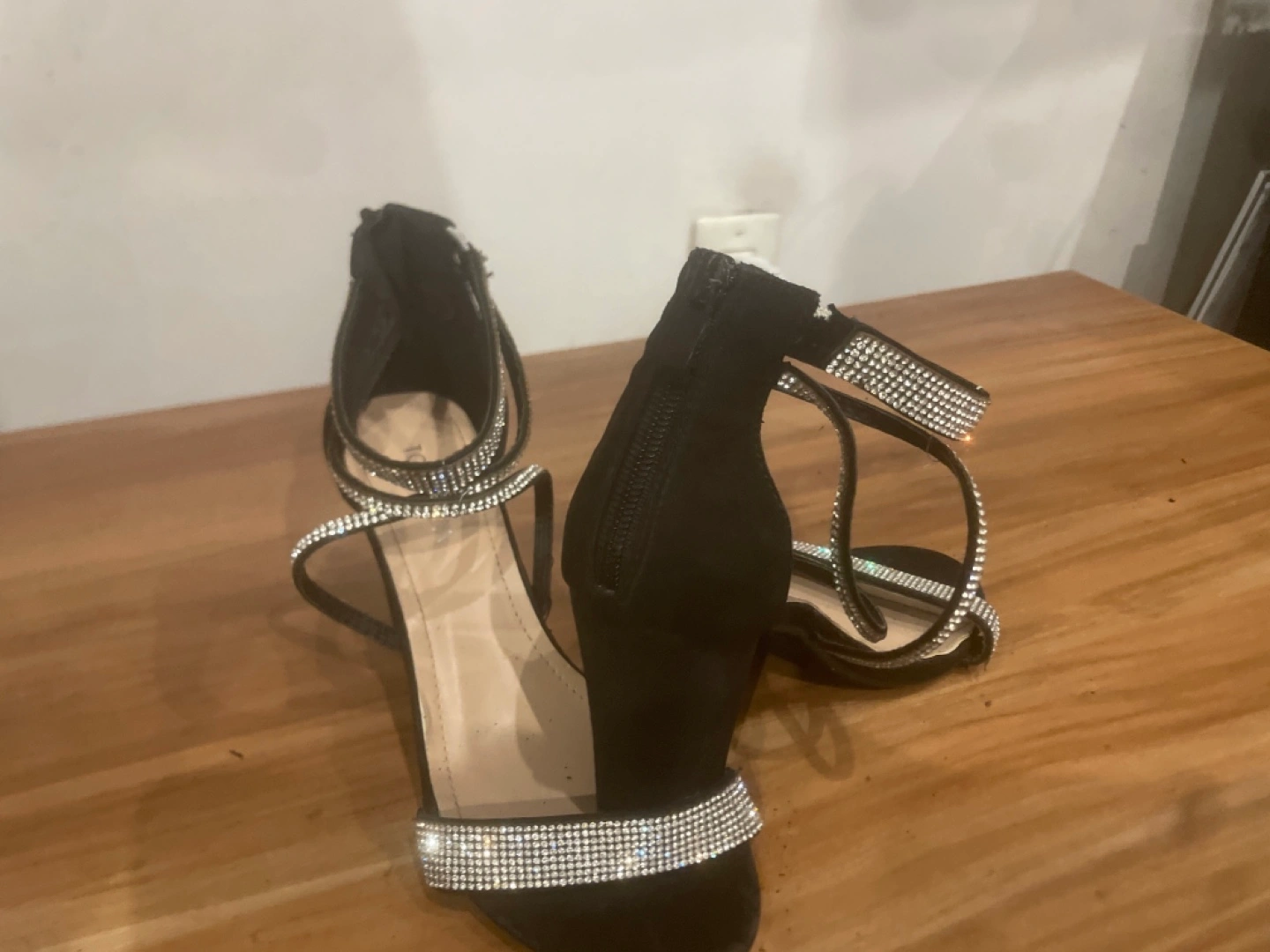 151Selling a pair of Top Moda black heels with rhinestone detailing. These heels feature a zipper back and are in good condition!