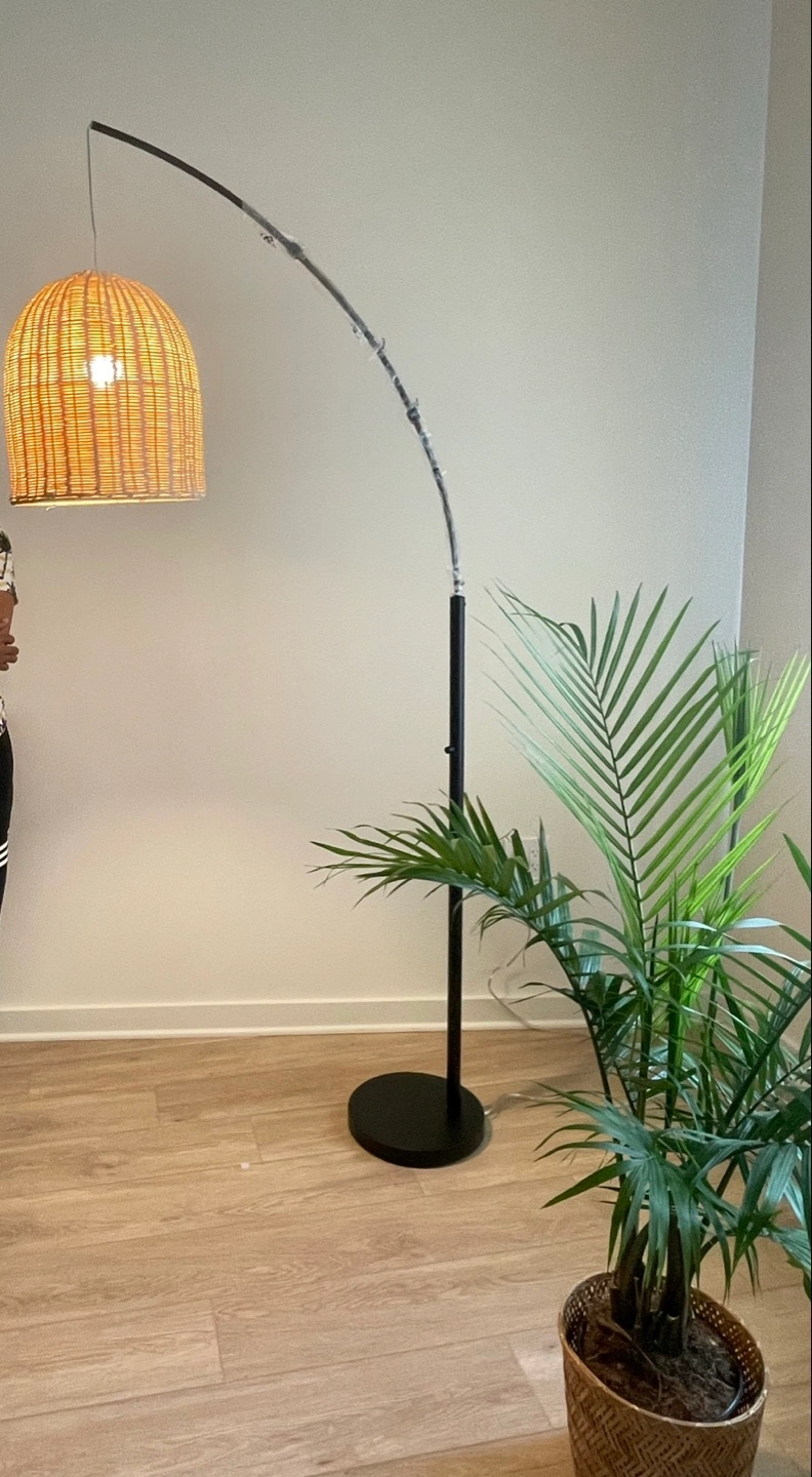 Selling a stylish arc floor lamp featuring a rattan shade. This lamp adds a warm and inviting touch to any room with its natural woven texture and sleek design. Perfect for creating a cozy atmosphere in your living space!