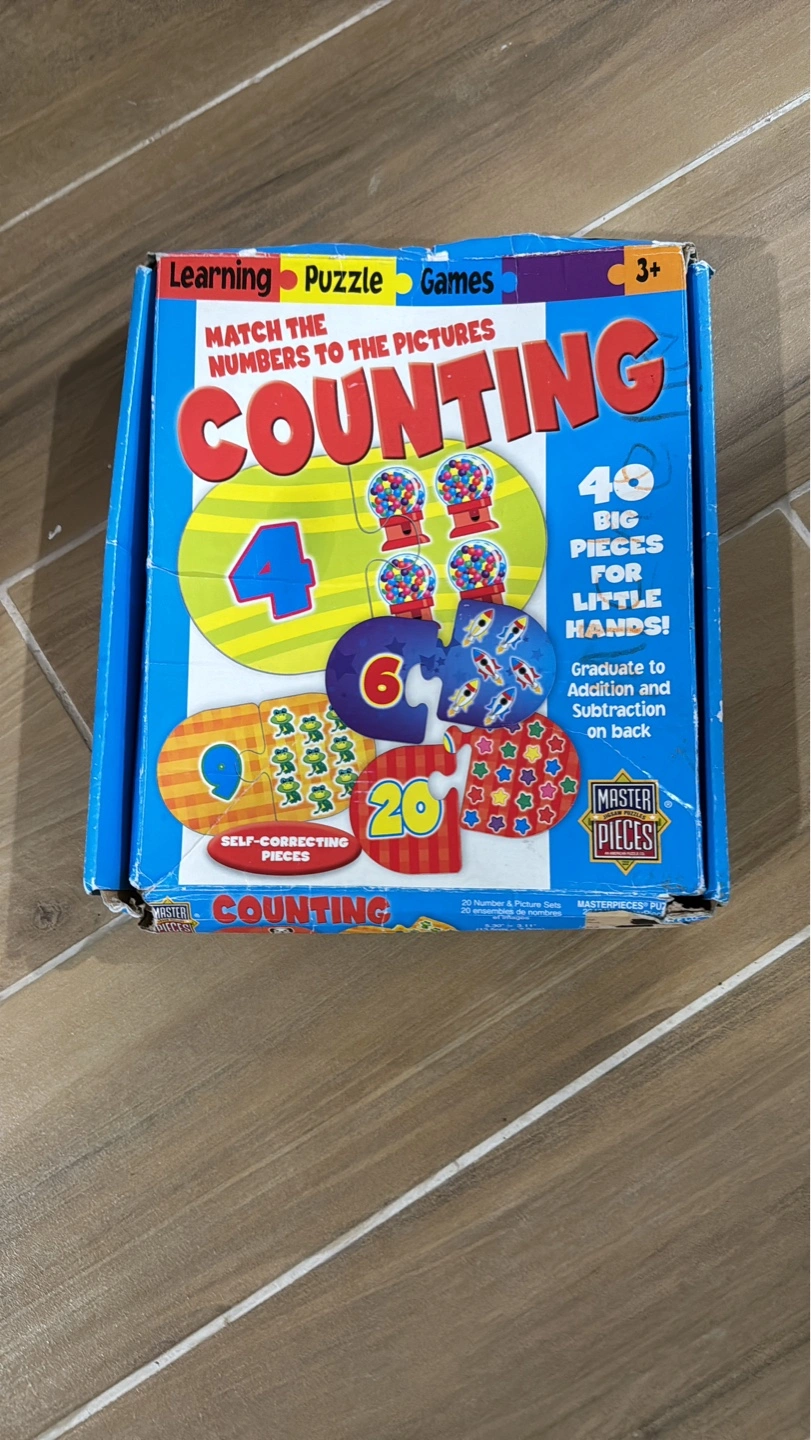 I'm selling a Master Pieces Counting puzzle game for little hands! It helps kids match numbers to pictures. The box includes 40 big pieces. This game is great for kids ages 3 and up