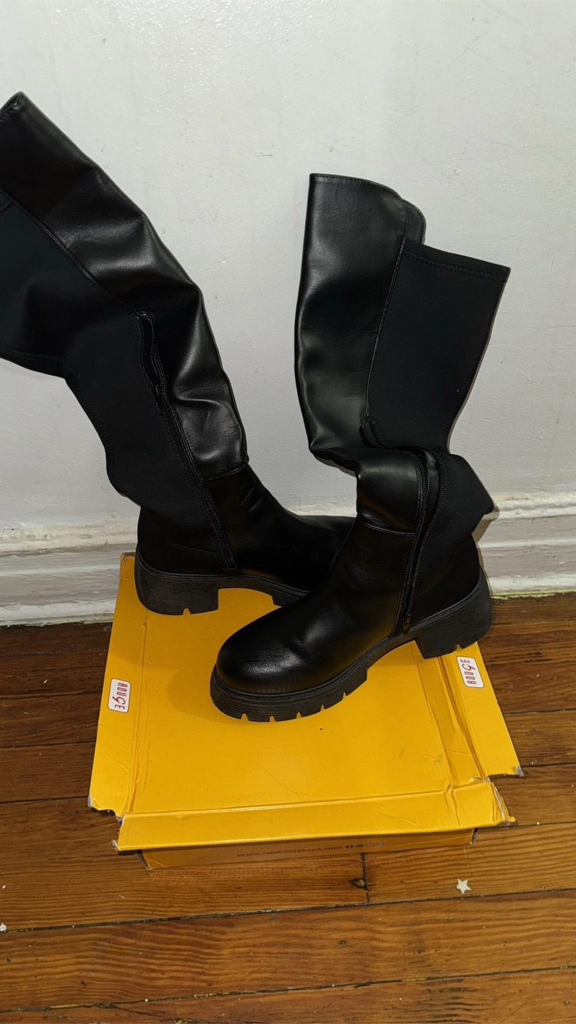 Selling a pair of black over-the-knee boots. They have a chunky sole and a side zipper. Perfect for fall and winter! Brand new only wore once !!! Very comfortable!