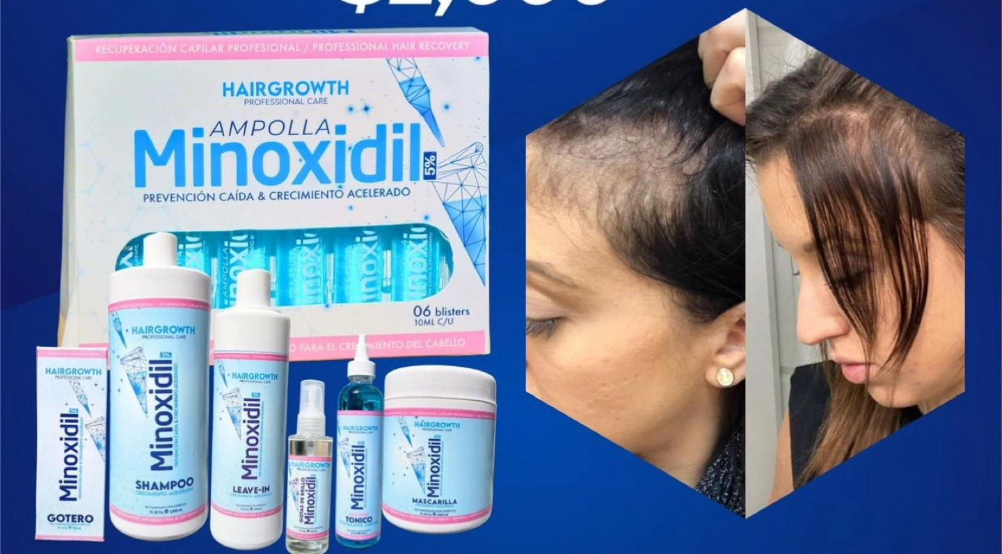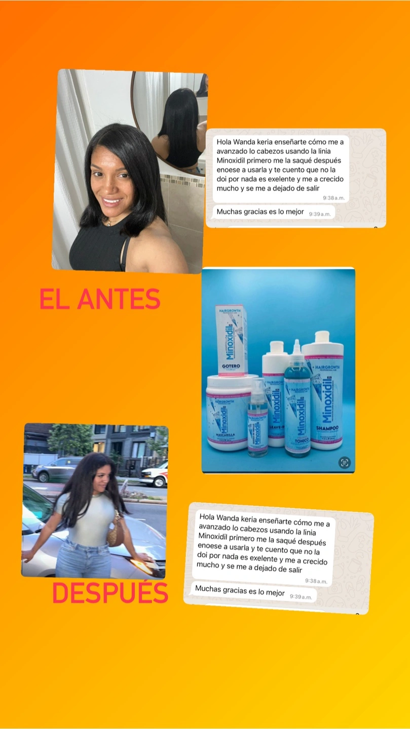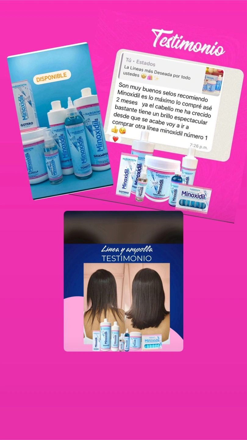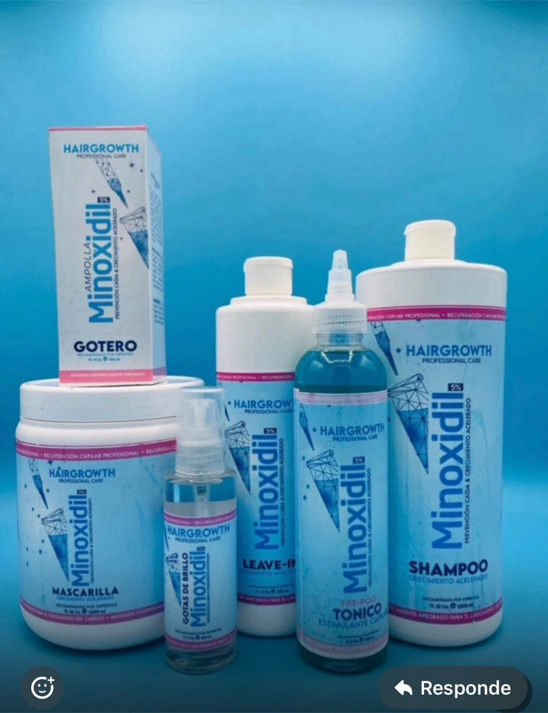 I'm selling a complete set of Hairgrowth Minoxidil Professional Care products! This set includes: - Ampolla Minoxidil - Mascarilla - Gotas de Brillo Minoxidil - Leave-In - Pre-Poo Tonico Estimulante - Shampoo