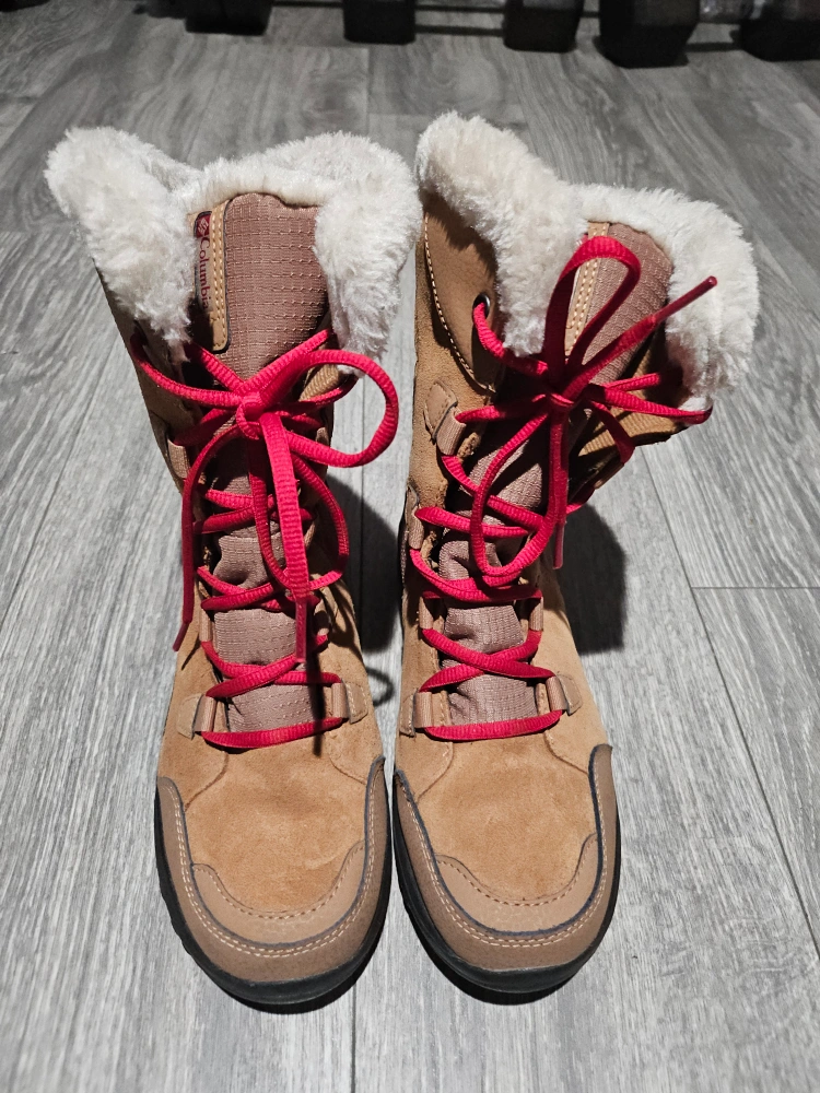 Selling a pair of women's Columbia winter boots. They are in good condition and ready to keep your feet warm this winter! These boots have a tan color with red laces and a faux fur trim.