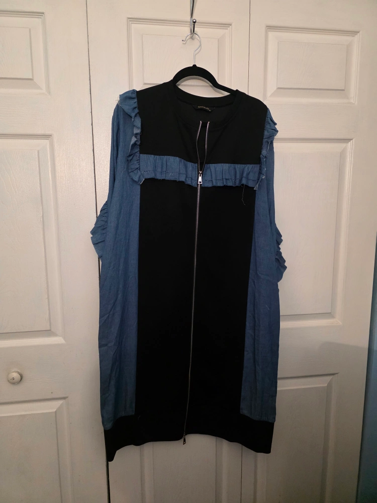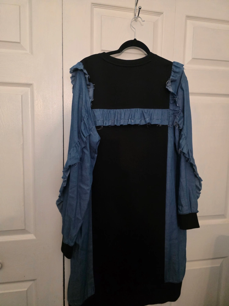 Selling a black and blue dress. It's in great condition and has a unique design with denim-like fabric on the sides and ruffles on the sleeves. size large/xlarge