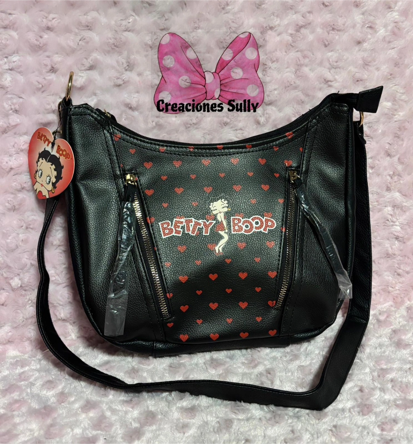 Cute Betty Boop shoulder bag! It's black with a fun Betty Boop design and little red hearts. Perfect for adding a touch of retro charm to your outfit