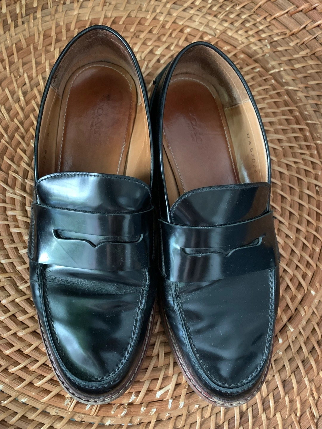 Selling a pair of Coach black leather loafers. They show some signs of wear but are in good condition overall. Perfect for a classic and stylish look!