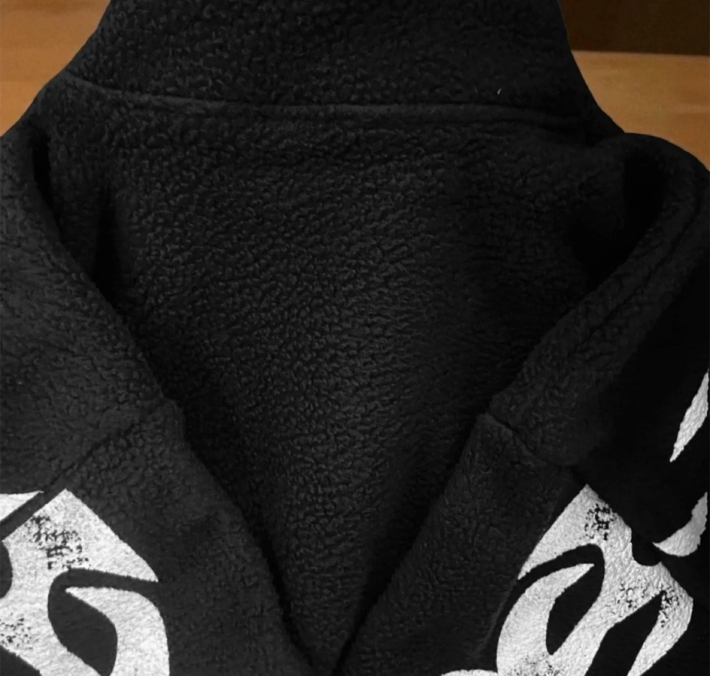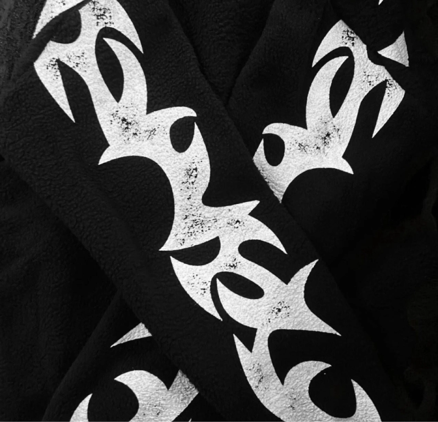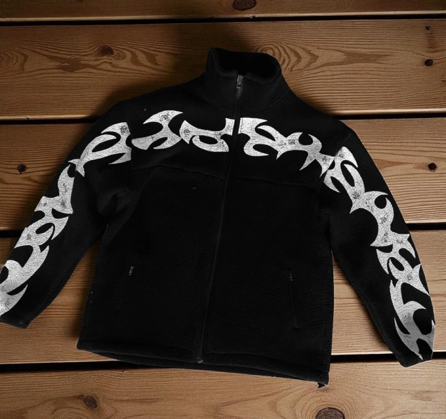 65Selling a cozy black fleece jacket featuring a unique tribal design. Great condition Perfect for keeping warmth Never Worn