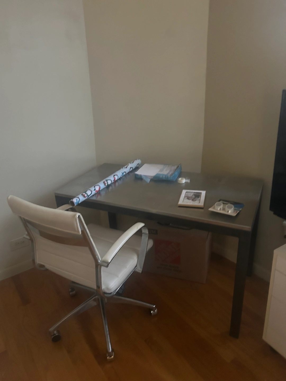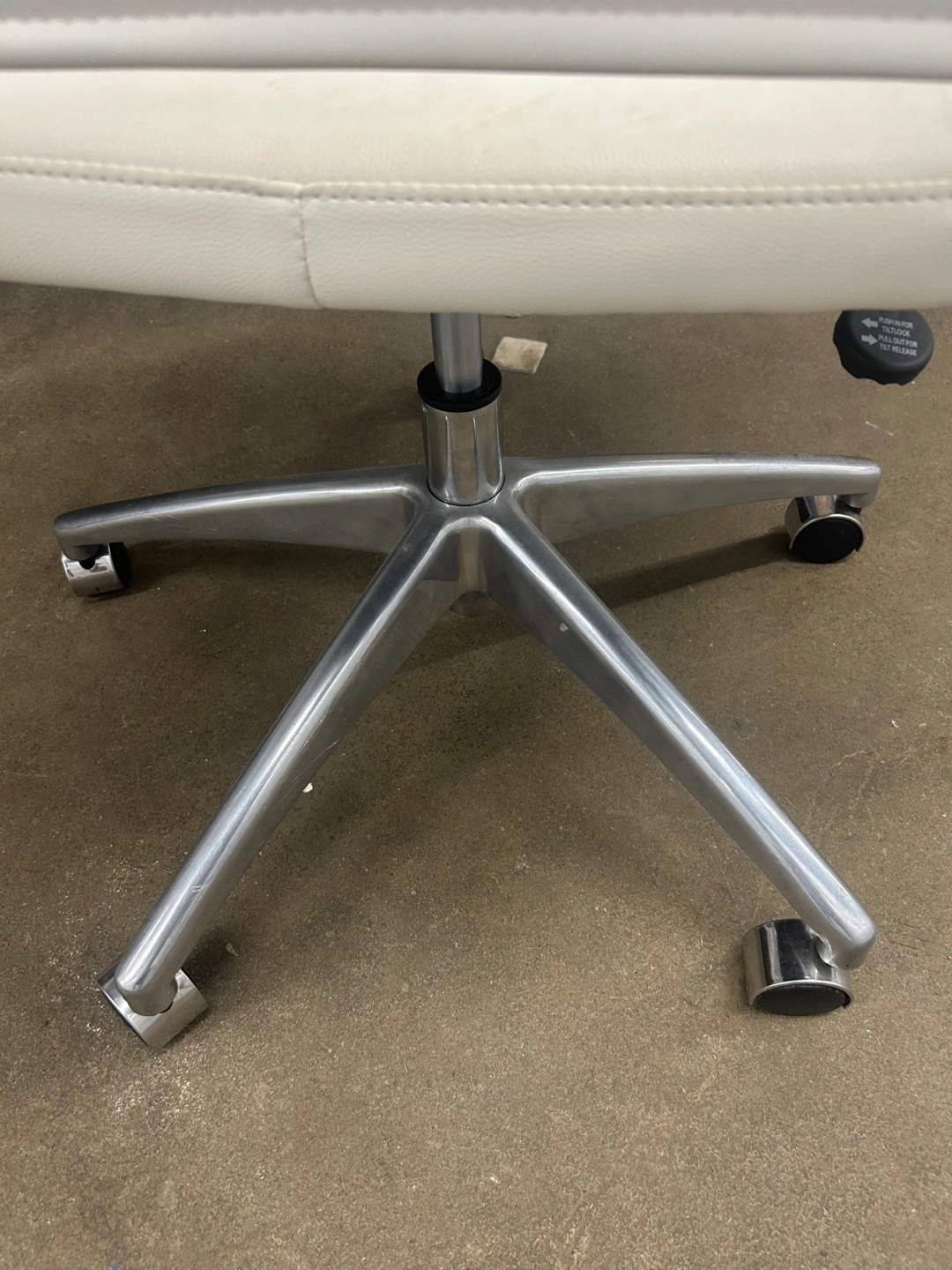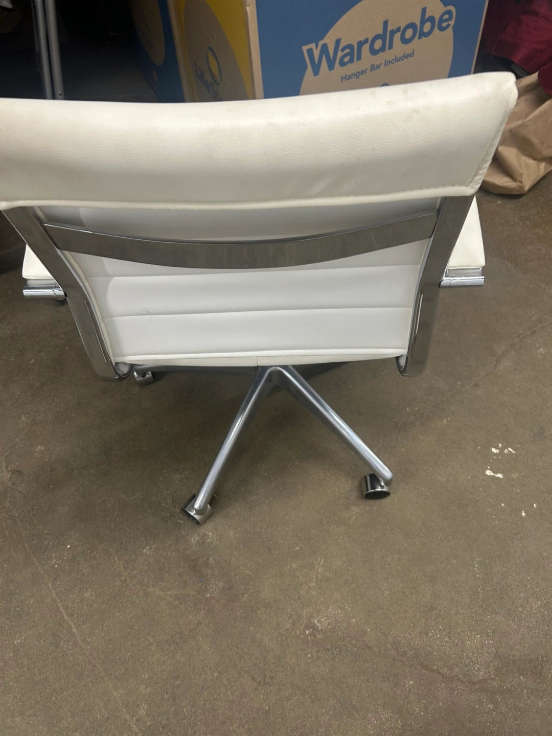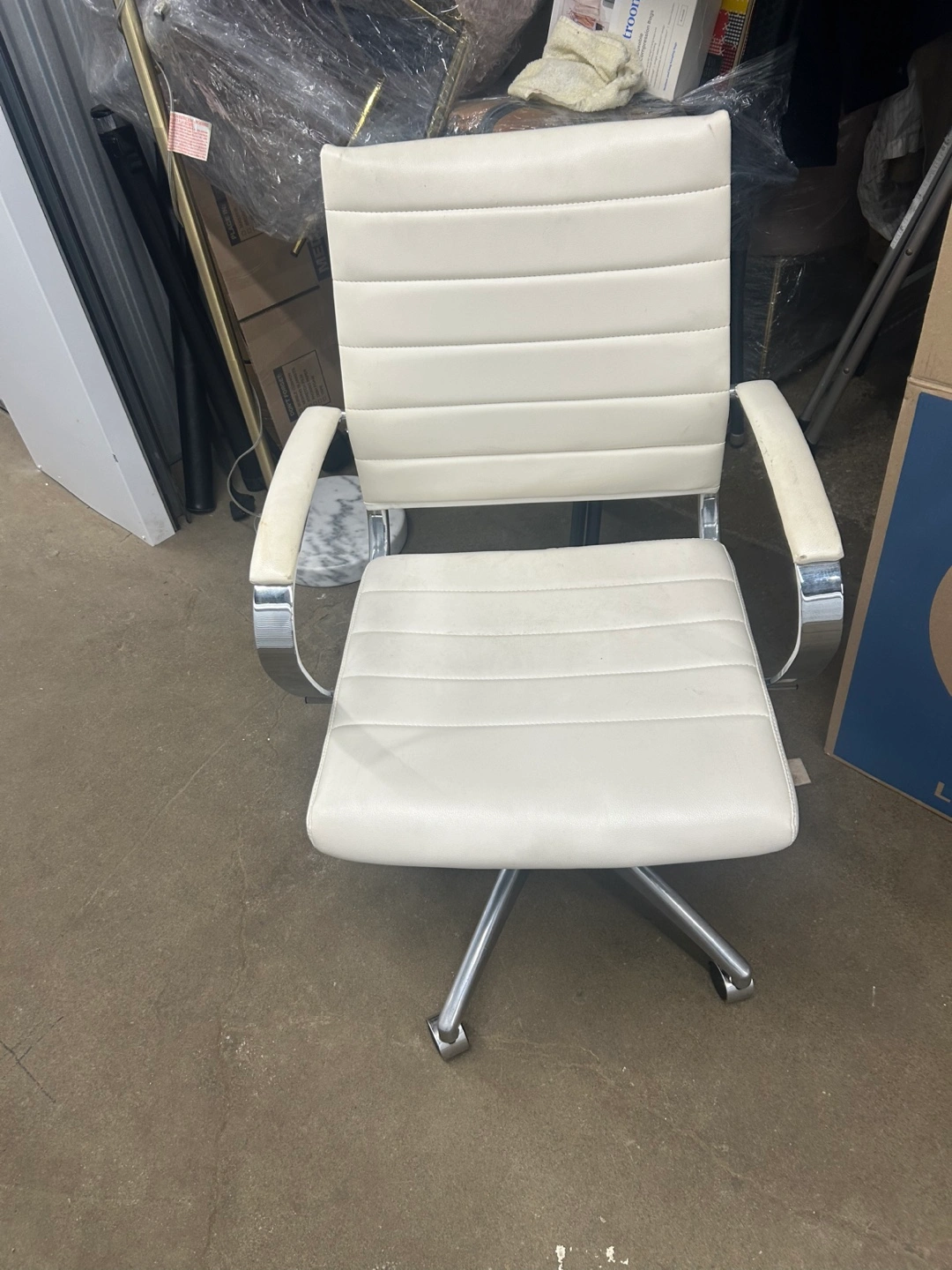 Selling a white ribbed office chair. It's in great condition and would be perfect for a home office or study space. The chair features a comfortable ribbed design and a sturdy base with wheels for easy movement. Desk is solid stainless steel