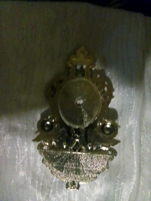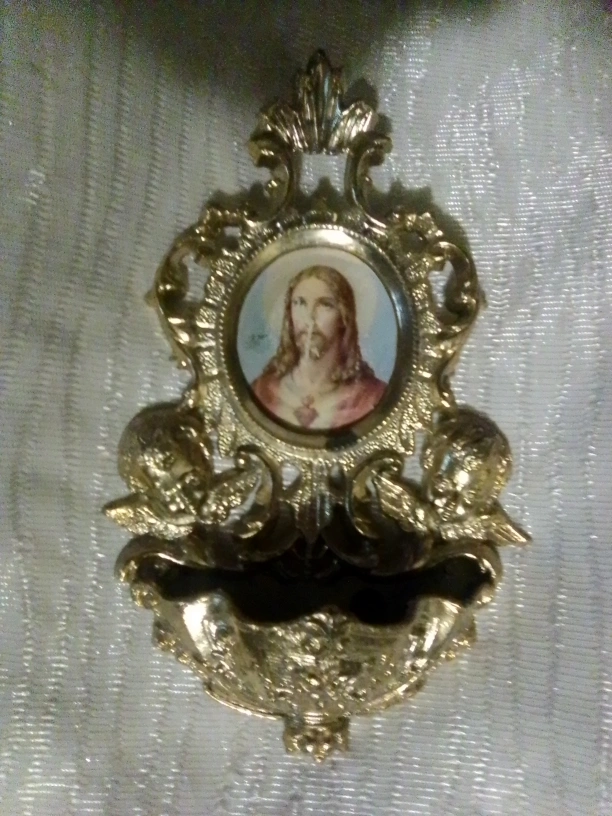 Selling a vintage gold-colored holy water font. It features a picture of Jesus and cherubs. It's in good condition. 8x5x2