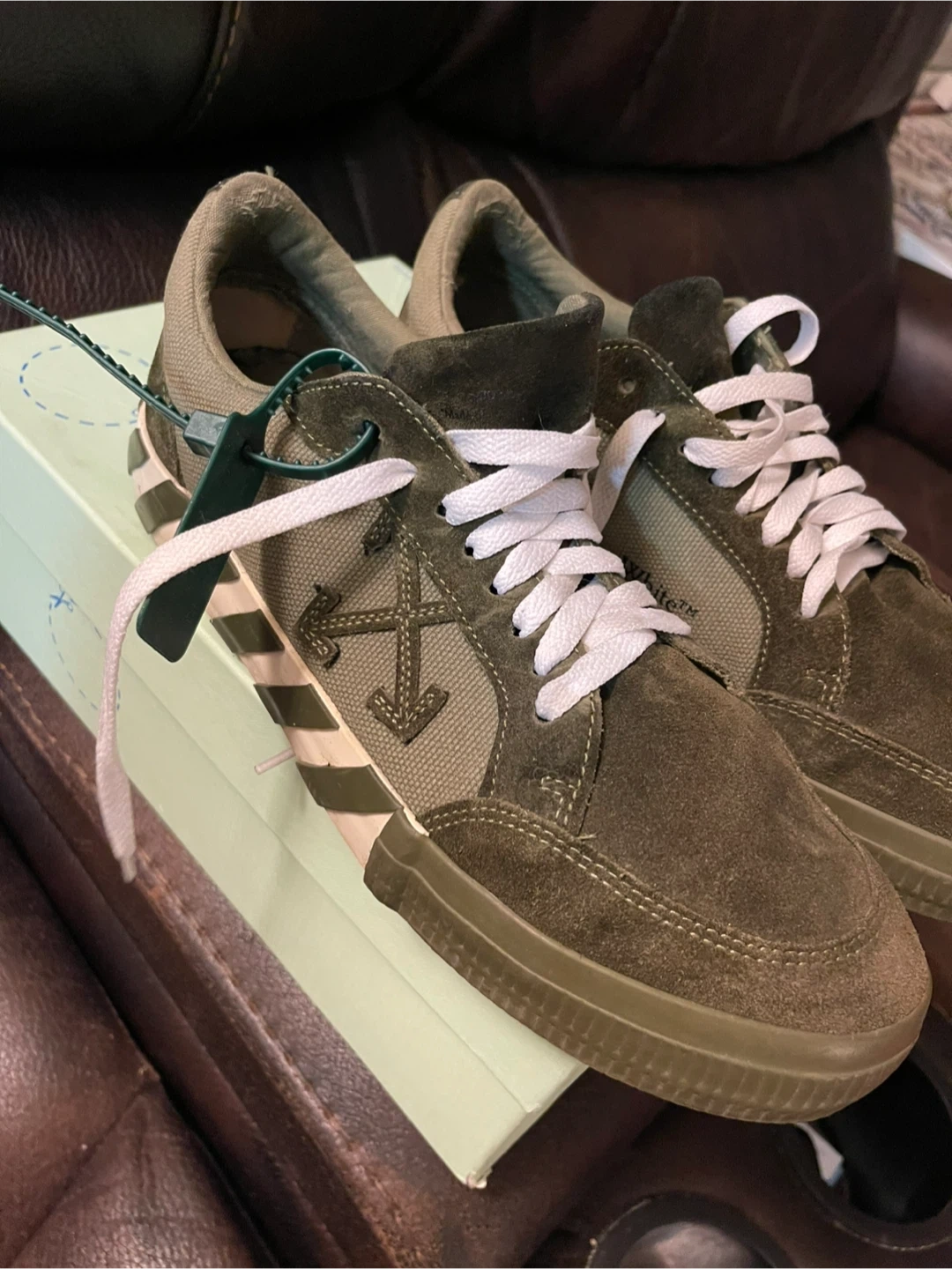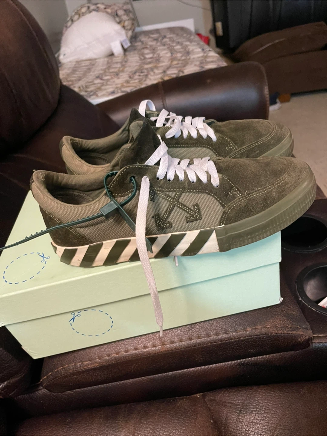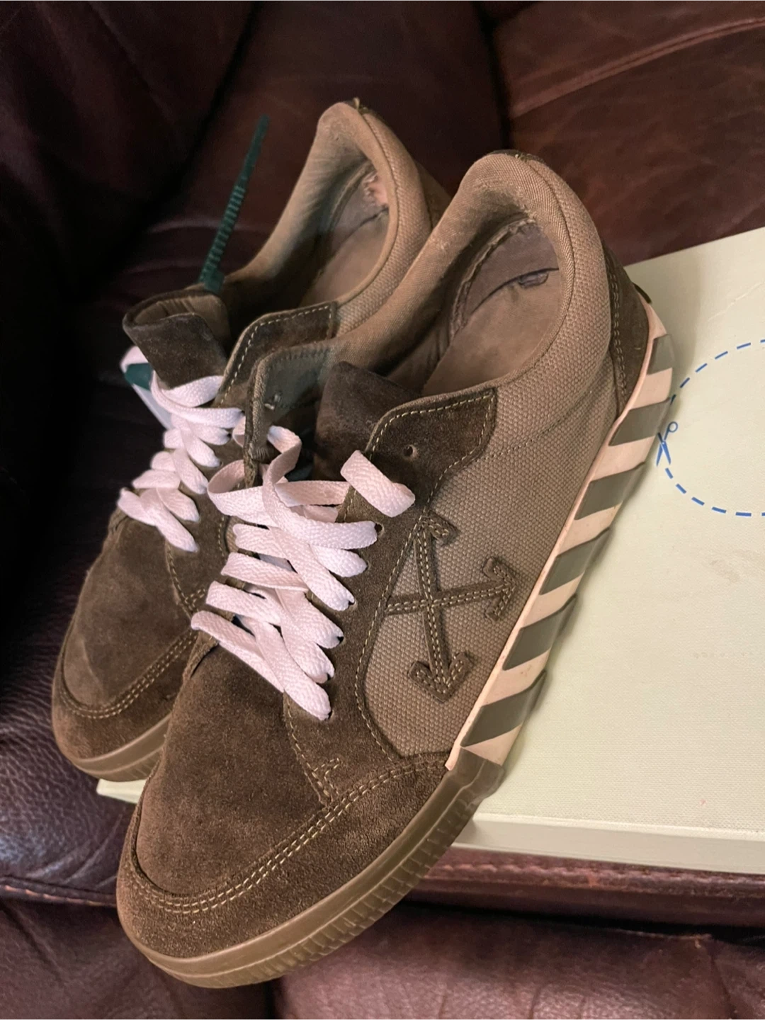 Selling a pair of Off-White Vulcanized Low Top sneakers. These are a size 43. They show some signs of wear, but are still in good condition and come with the original box.