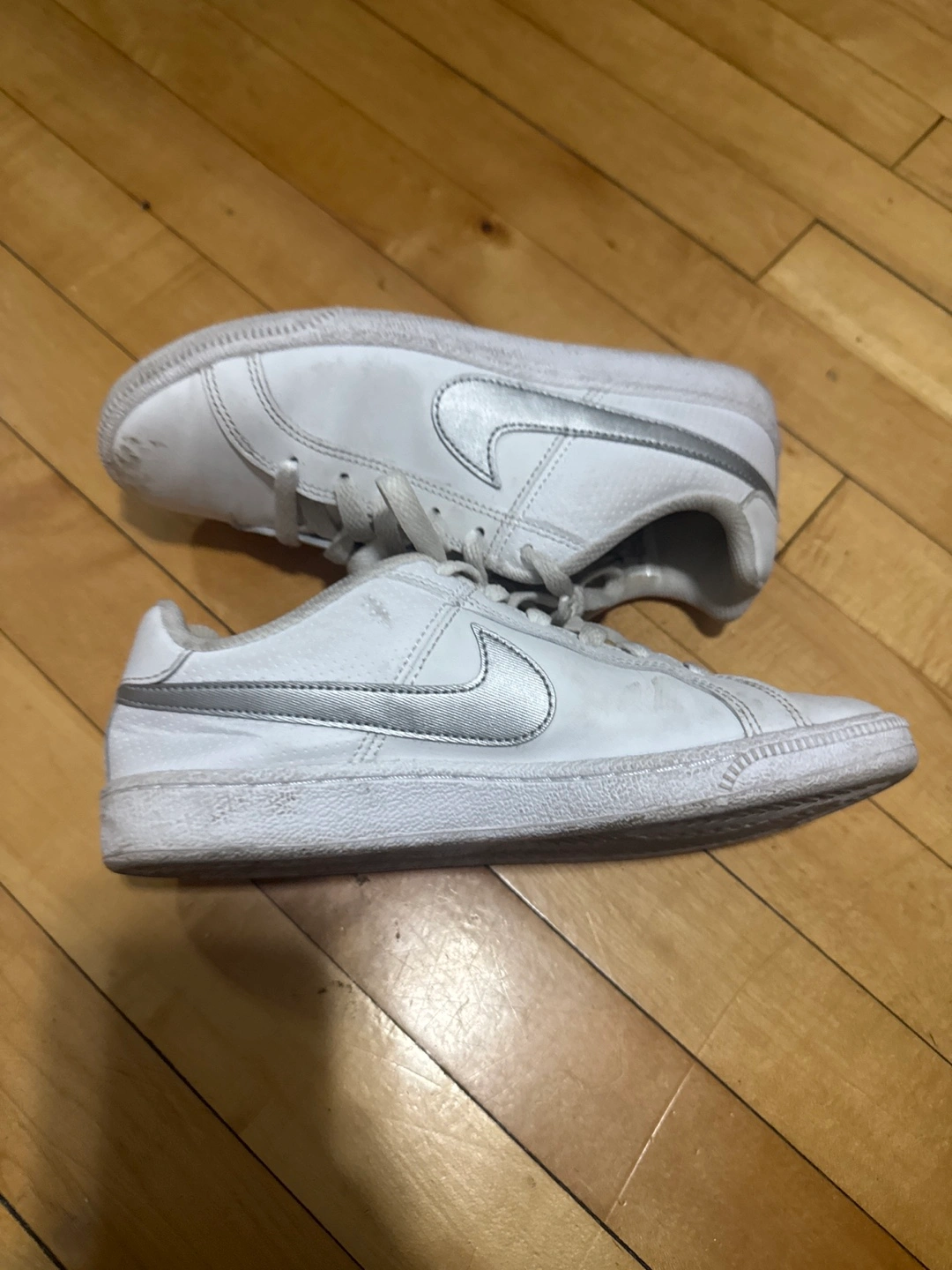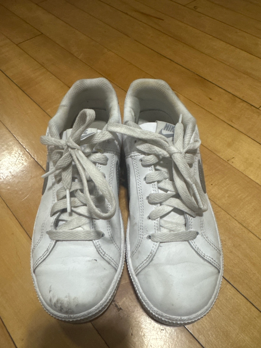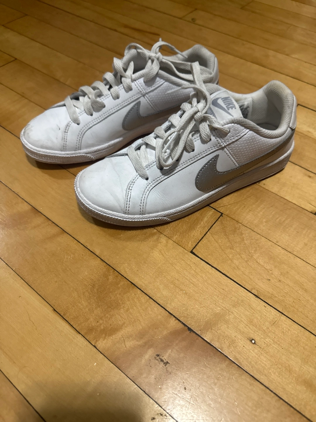 Selling a pair of Nike Court Royale sneakers in white. They show some signs of wear, as you can see in the photos, but they're still in good condition for casual wear. These are classic, comfortable sneakers that go with just about anything!