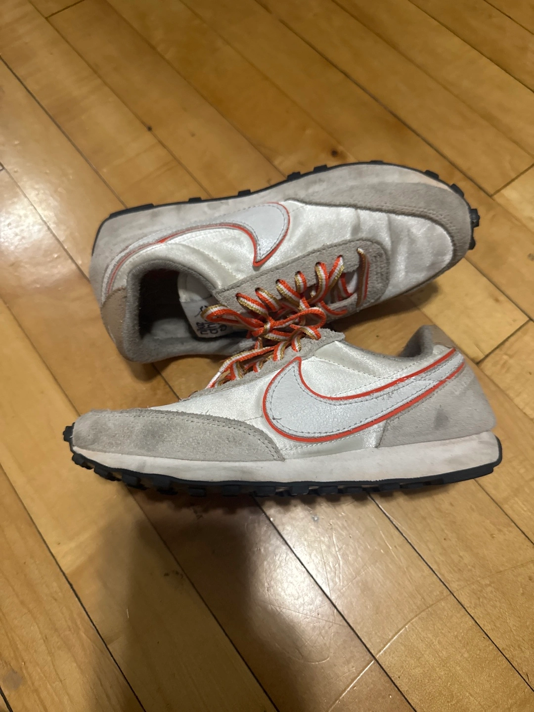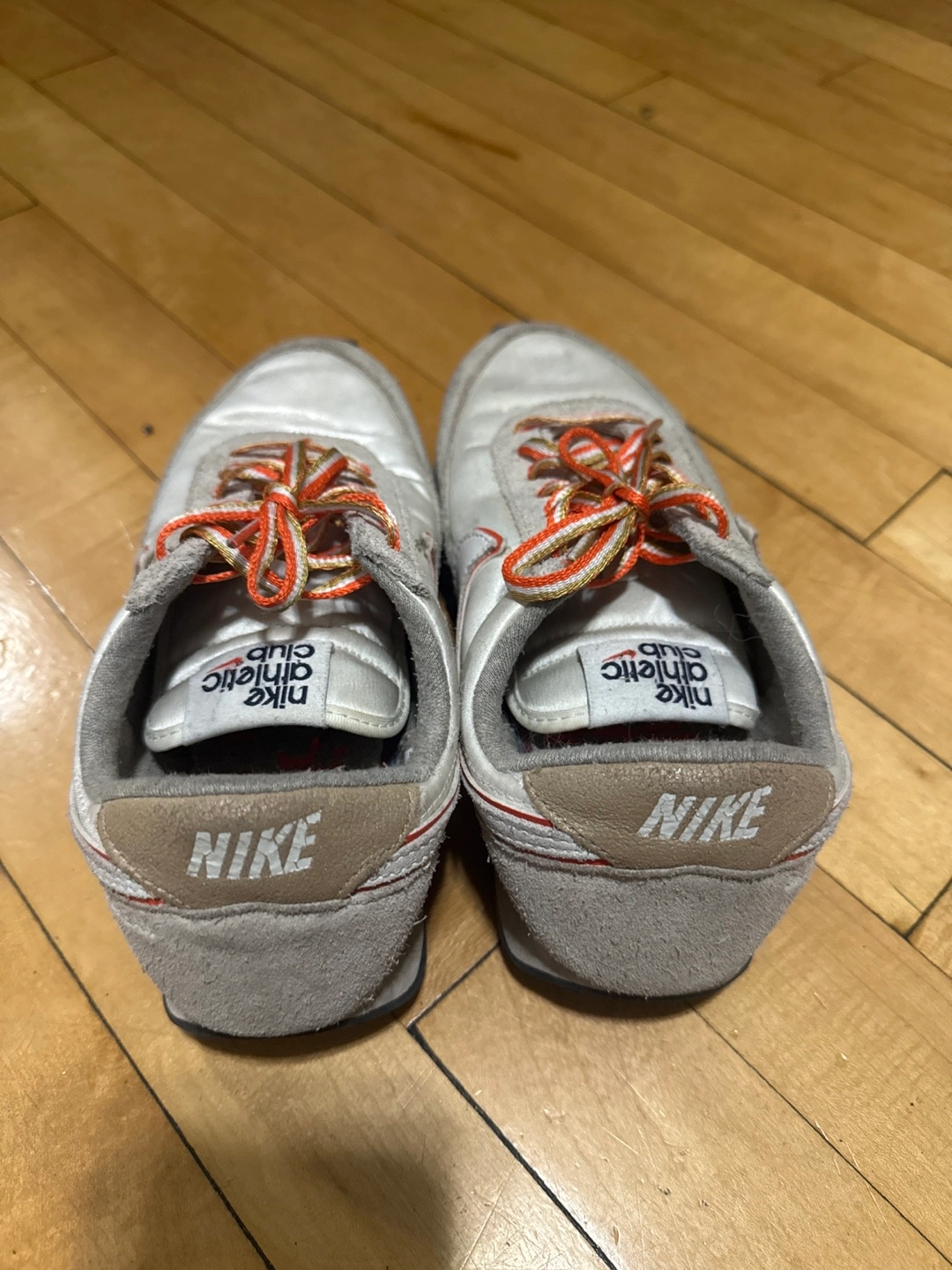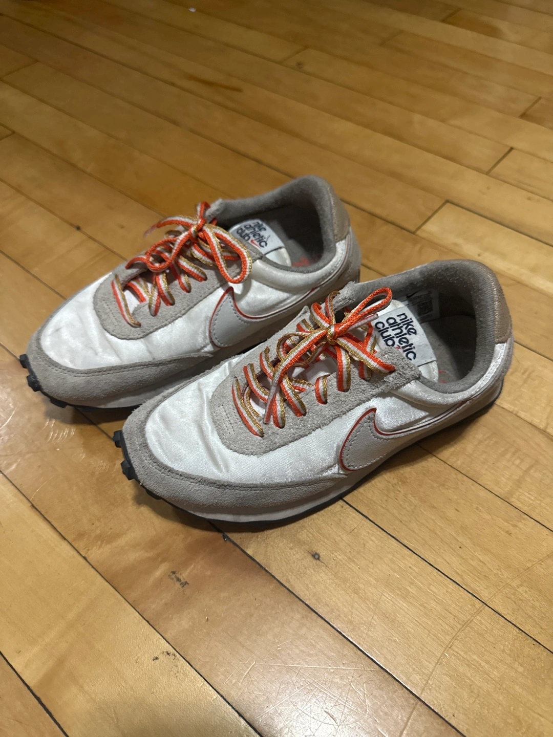 Selling a pair of Nike Athletic Club sneakers. They show some signs of wear but are still in good condition for everyday use! The laces have a unique orange and gold color combination. Great for casual wear or light athletic activities