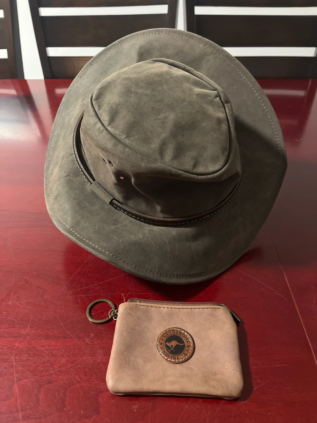 1000+Selling a Kangaroo leather Australia hat and a matching coin purse. The hat is a stylish accessory, and the coin purse is perfect for carrying small items.