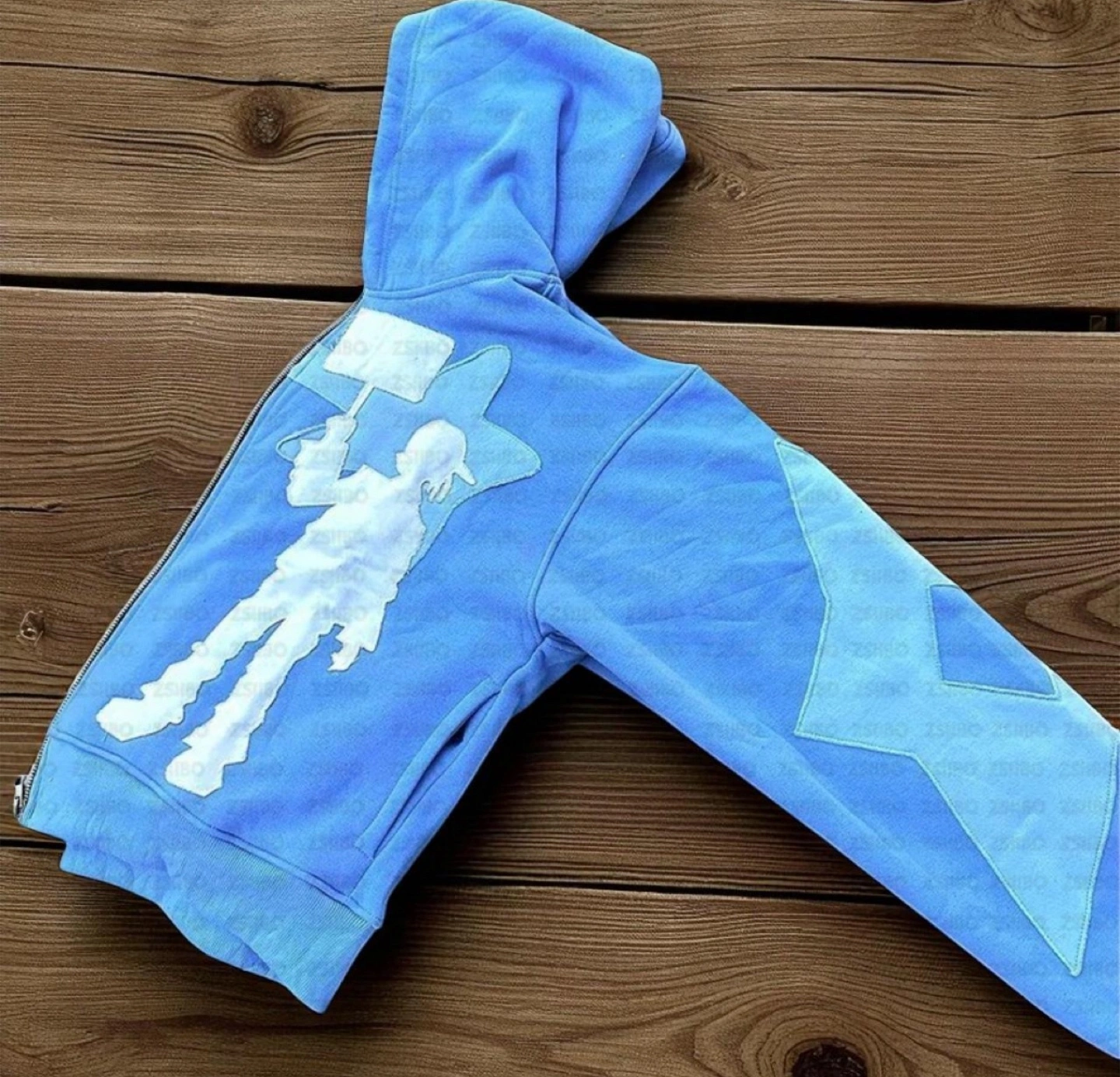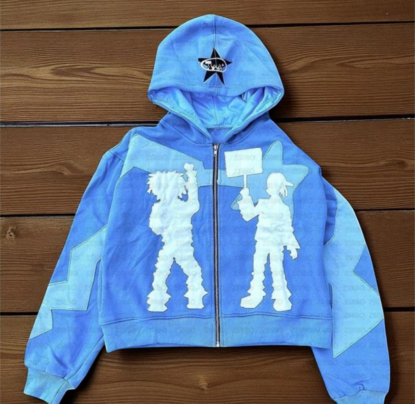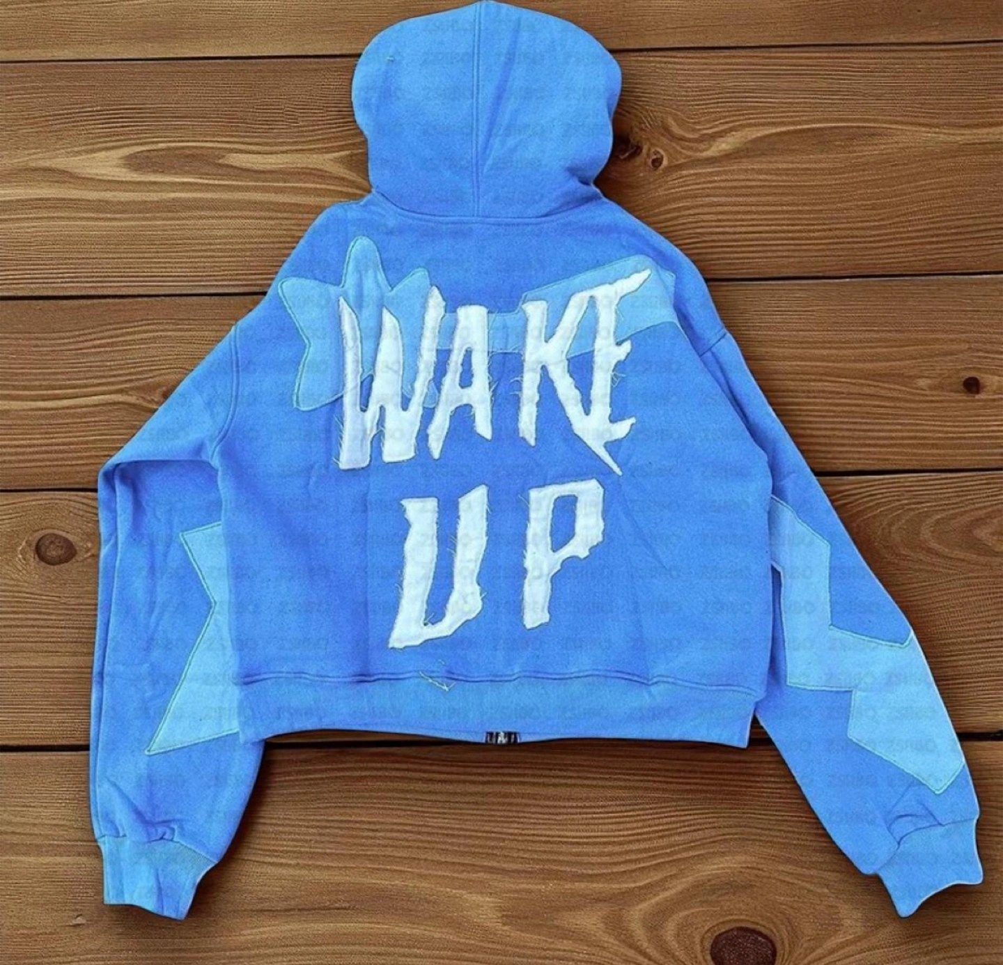 Blue zip up hoodie with star designs. The back says "Wake Up” Features a unique design with figures on the front. Size M