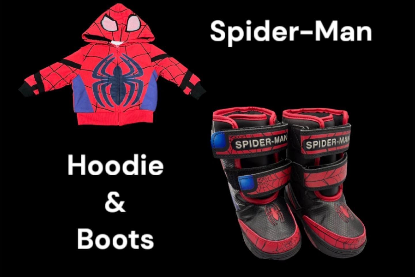 Get your little one ready to swing into action with this adorable Spider-Man hoodie and boots set! The hoodie size medium features a classic Spider-Man design with a hood that has Spidey's eyes. The boots are size 9 Toddlers perfect for completing the look with their matching Spider-Man details.