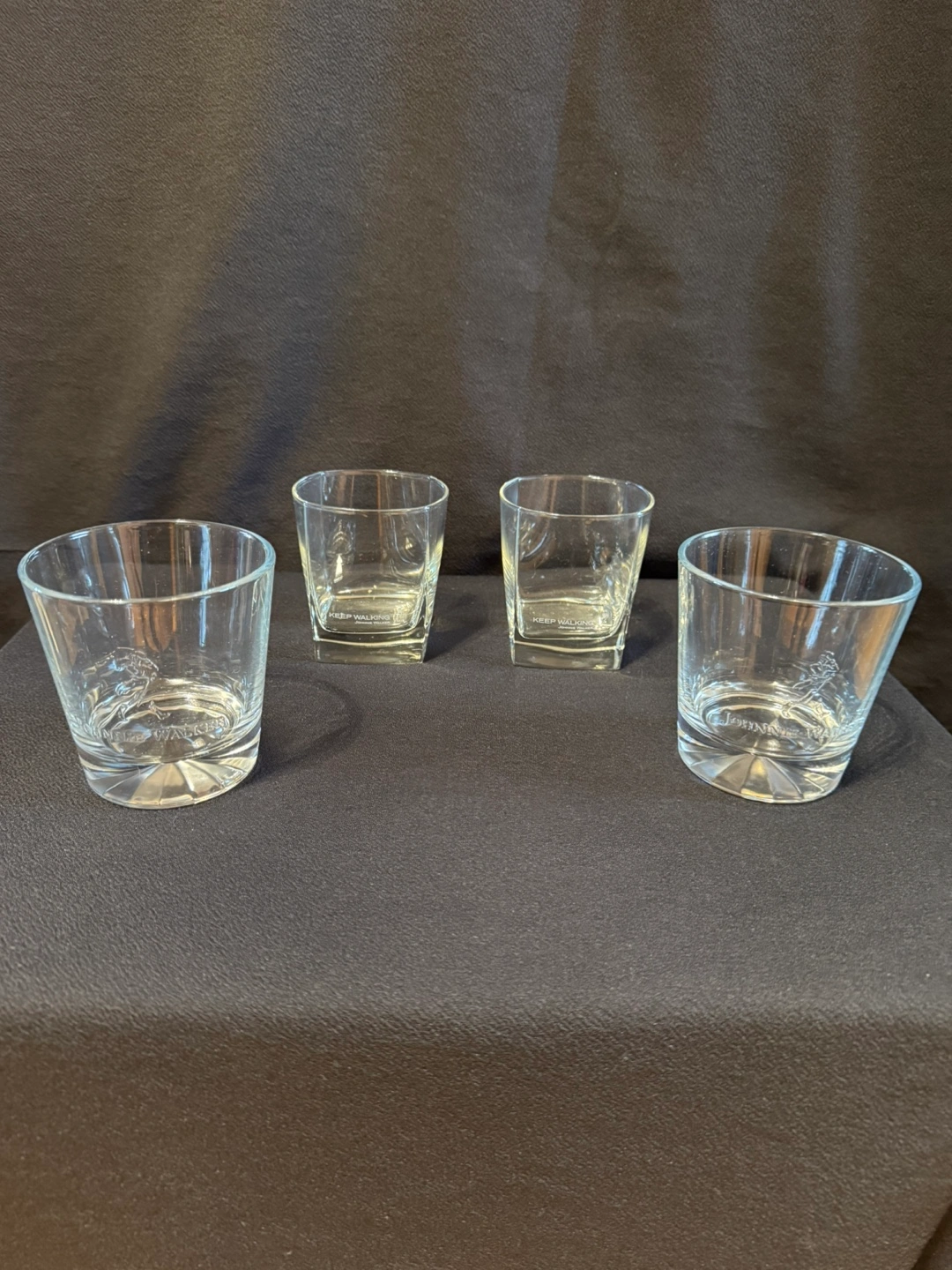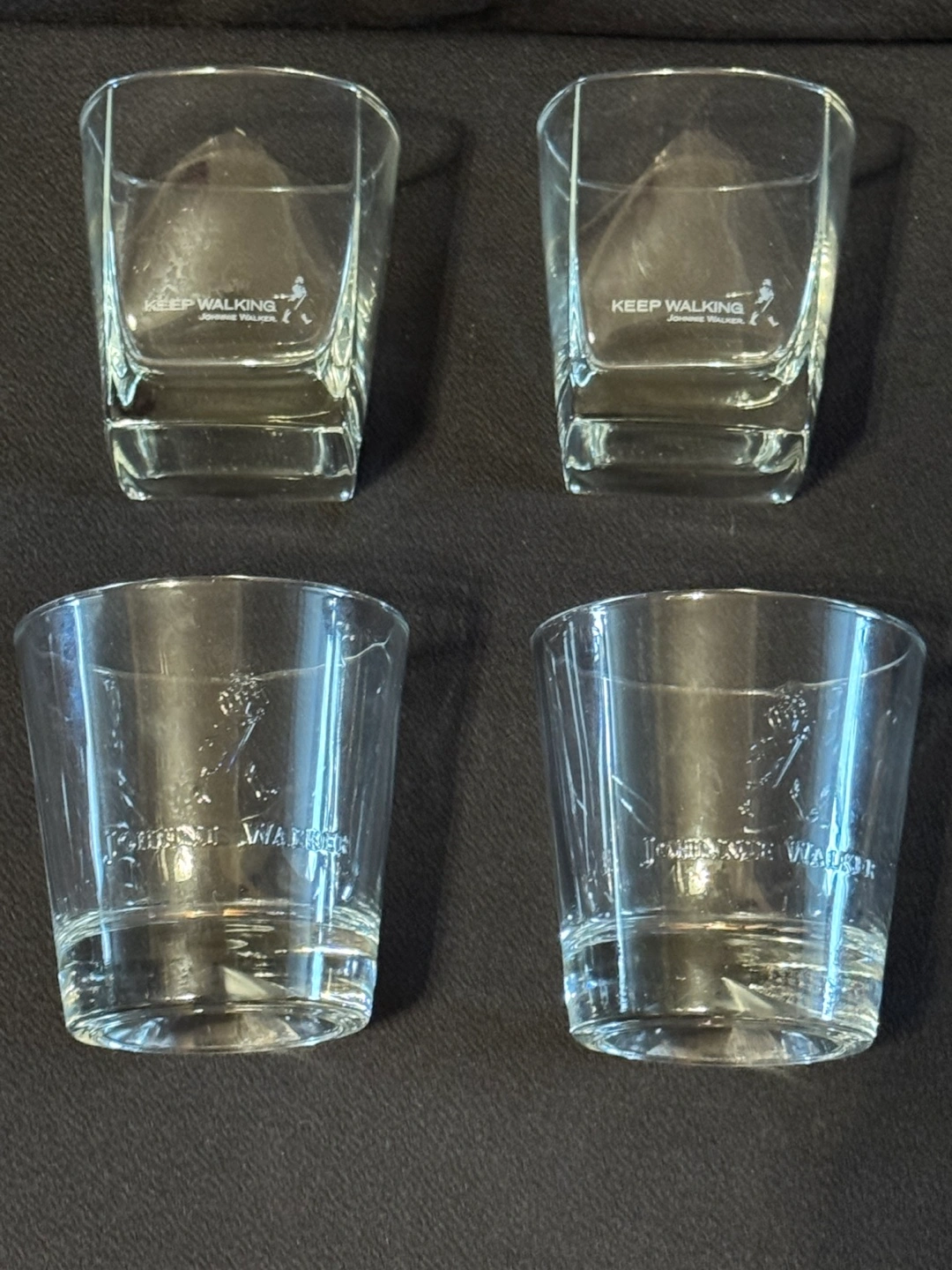 Selling a set of 4 Johnnie Walker whiskey glasses. They feature the iconic "Keep Walking" slogan and Johnnie Walker logo. Perfect for enjoying your favorite scotch!