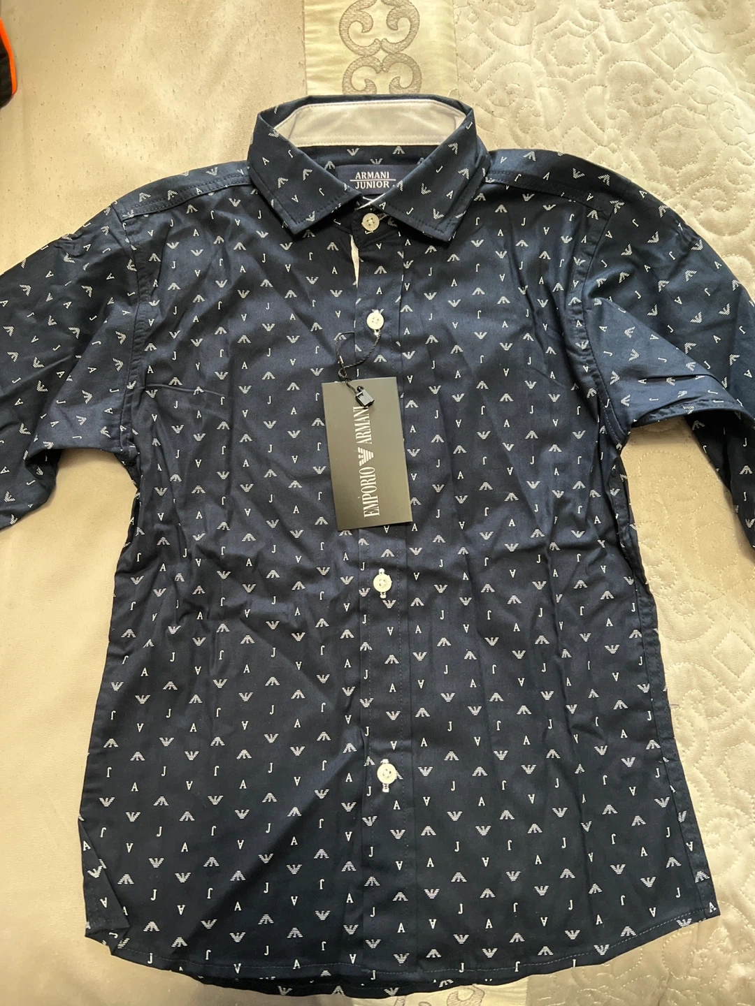 Here's an Emporio Armani Junior shirt. It's a stylish navy blue color with a subtle pattern. Perfect for your little one!