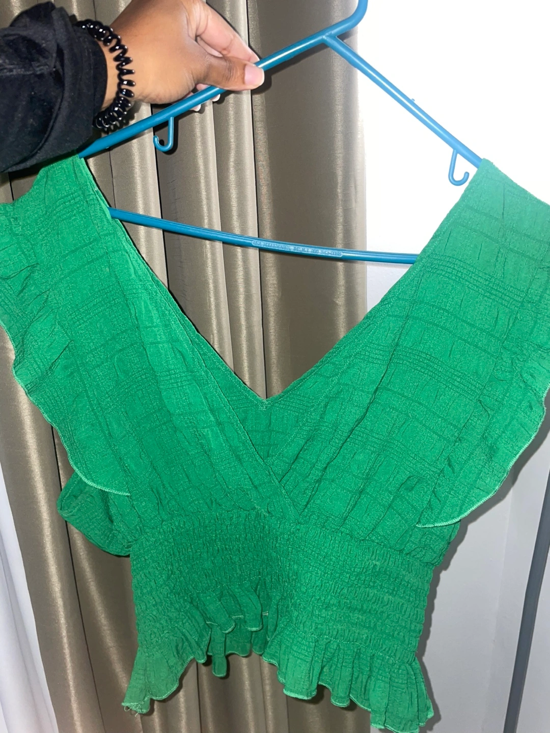 Selling a cute green V-neck top. It has a smocked waist and ruffle details. Perfect for a casual day out!