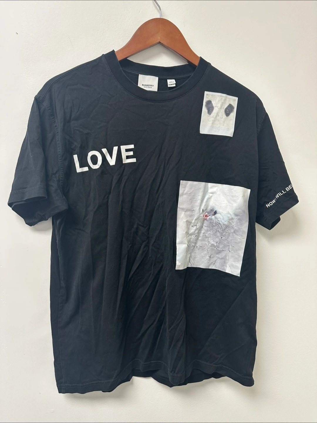 188Selling a cool black Burberry t-shirt. It features the word 'LOVE' in bold white letters on the front, along with some interesting graphic details. It's in great condition and ready for a new home!