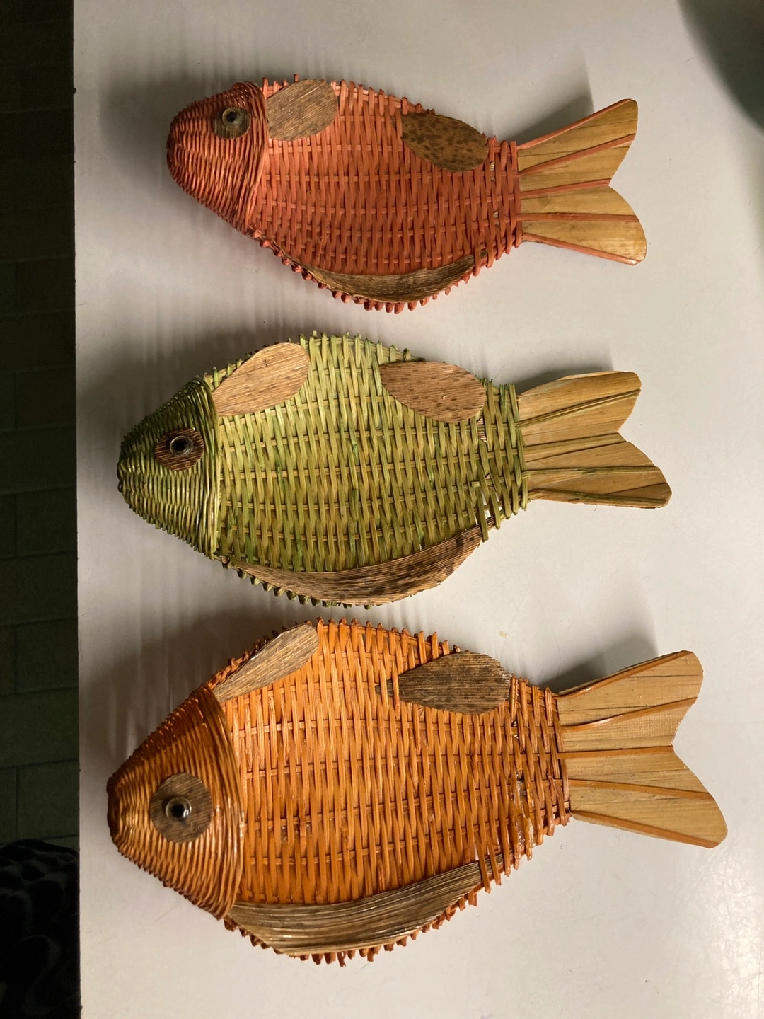 Here's a set of three cute wicker fish baskets! They come in various colours and are perfect for adding a touch of whimsy to your home decor. Length of plastic fork (see pic #2).