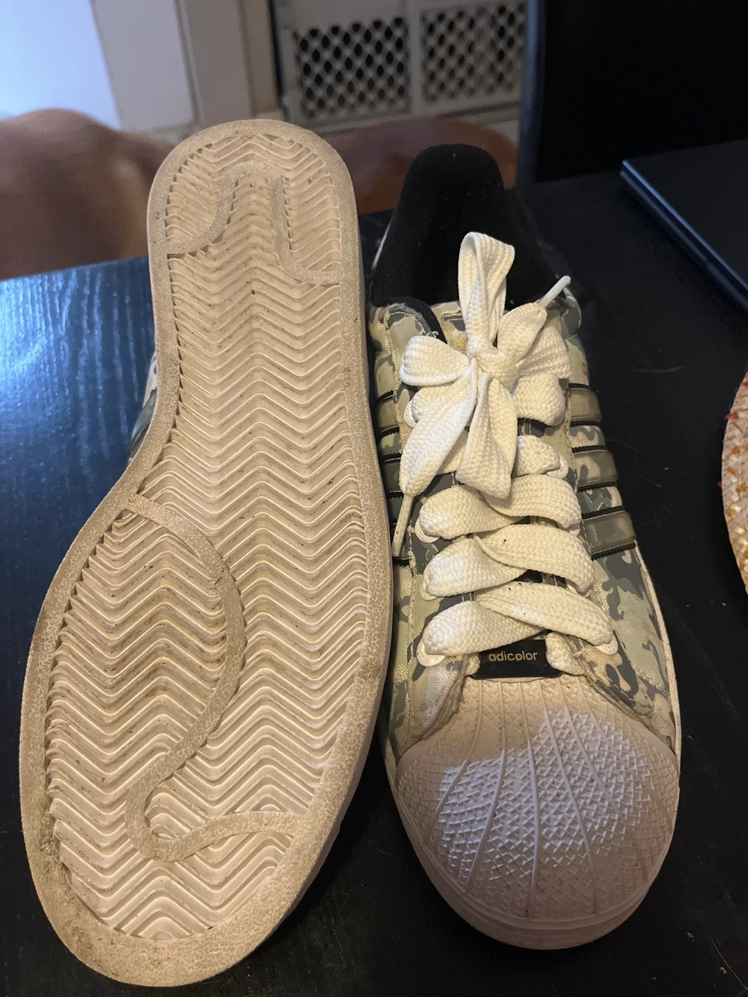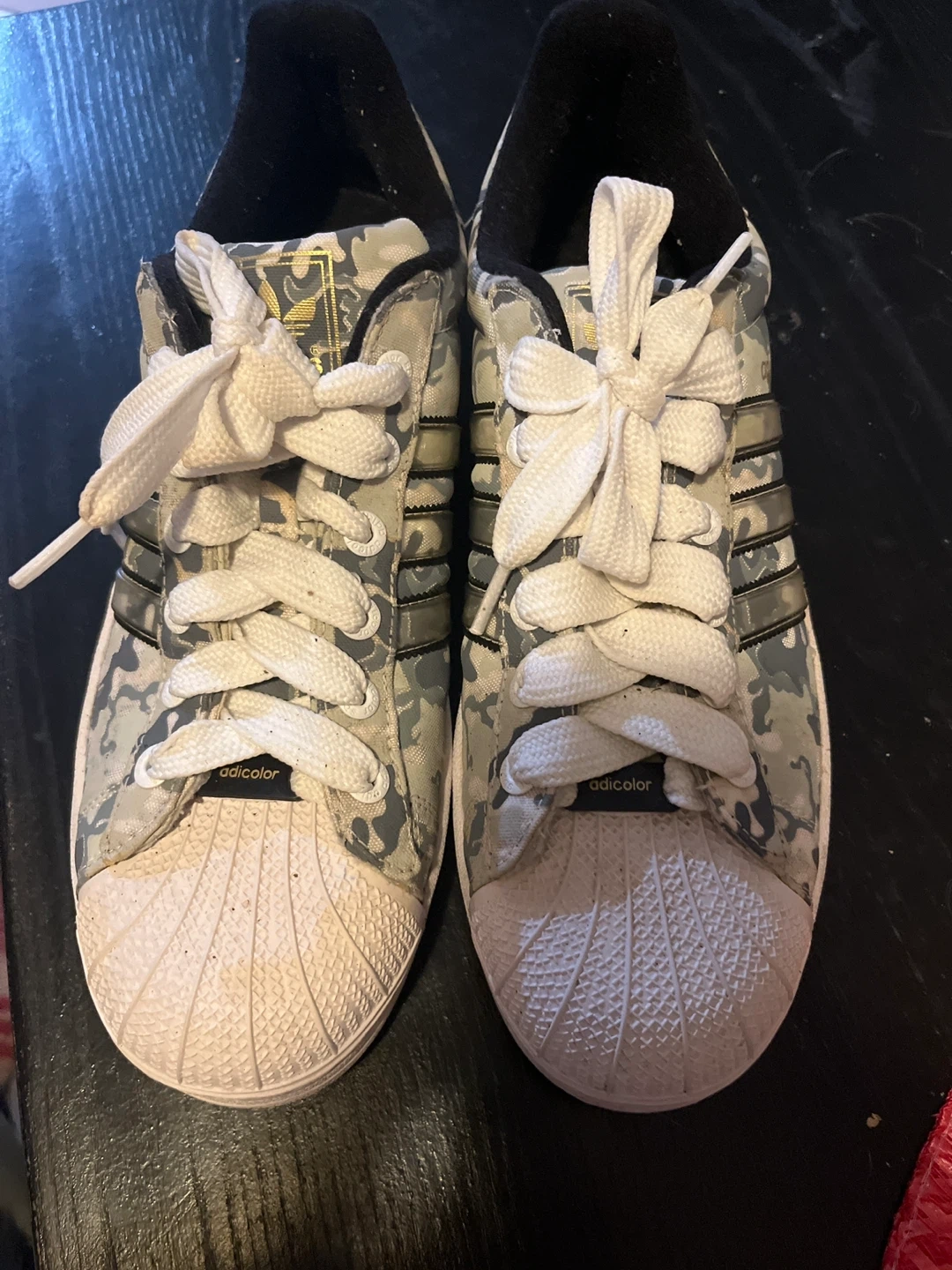 Selling a pair of Adidas Superstar Adicolor sneakers with a cool camo pattern. They're in good condition and ready for a new home. These Superstars are a classic style that never goes out of fashion!