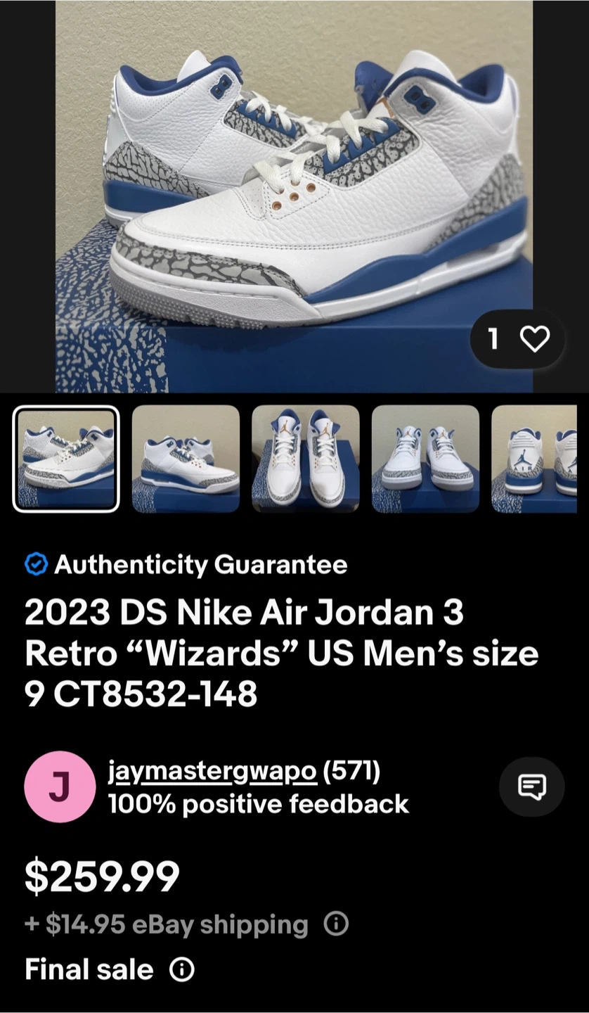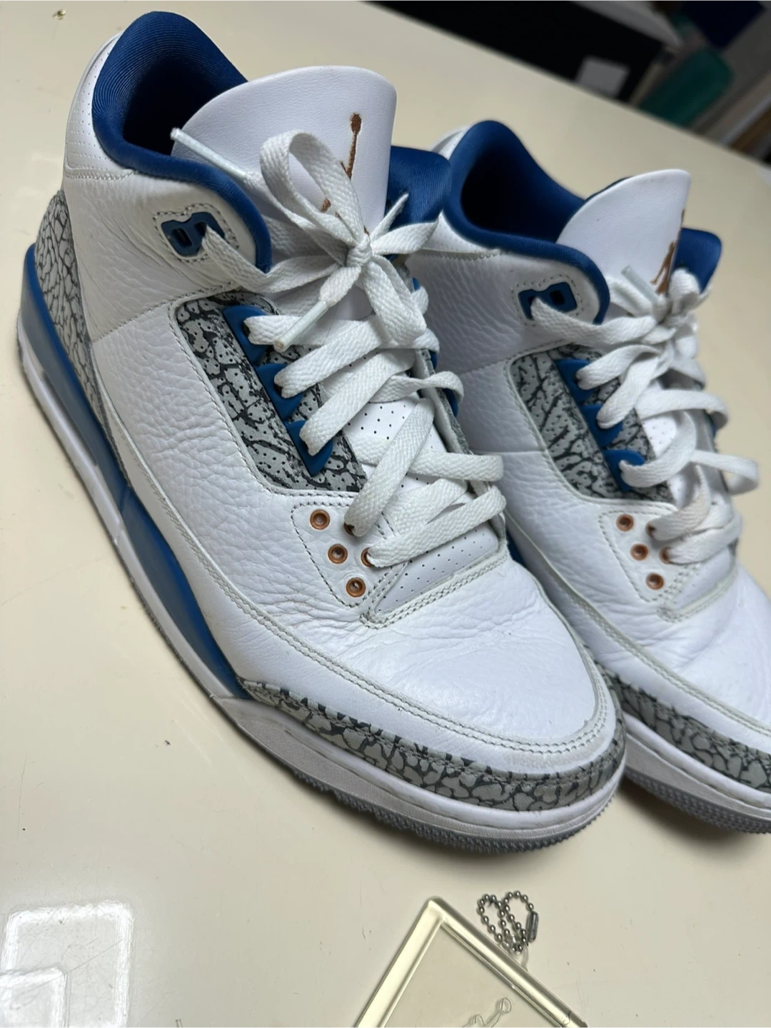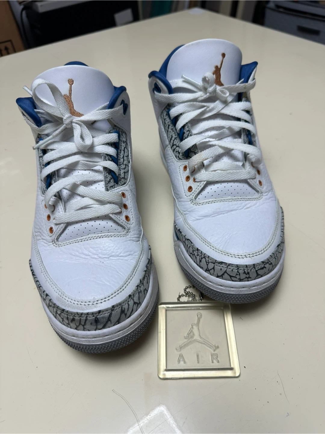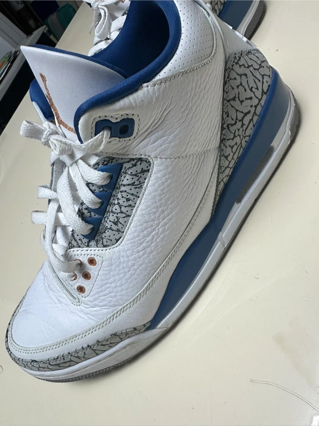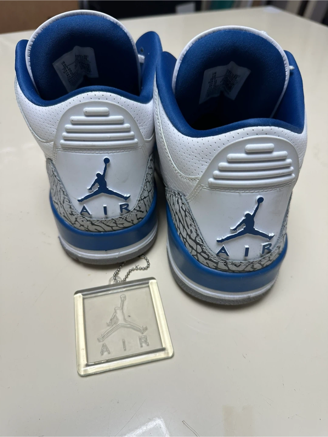 Selling a pair of Nike Air Jordan 3 Retro in the True Blue colorway. They are a US size 10. These shoes have the iconic elephant print and blue accents. They are in used condition, but have lots of life left!