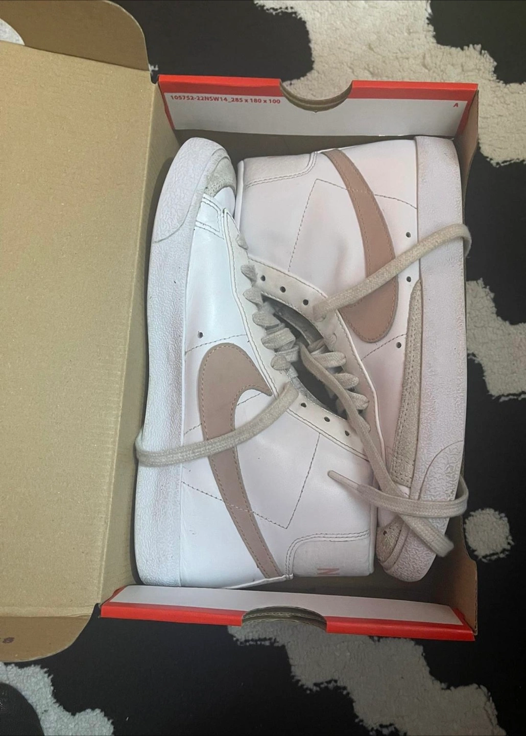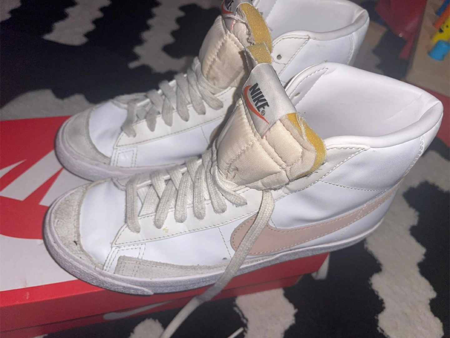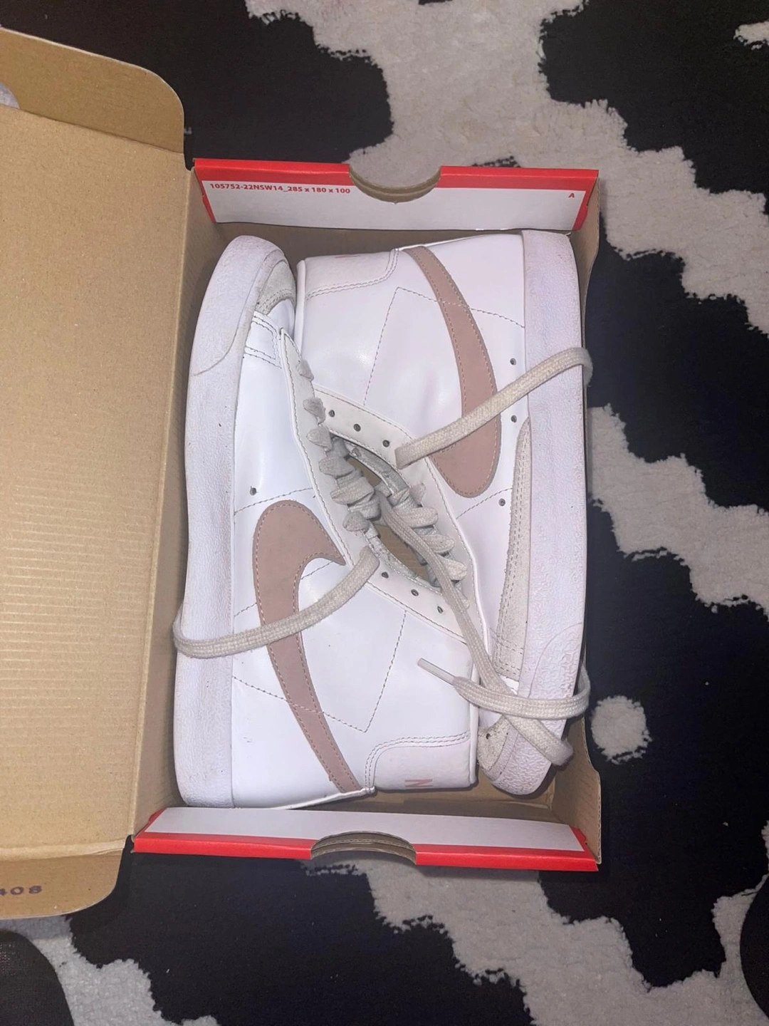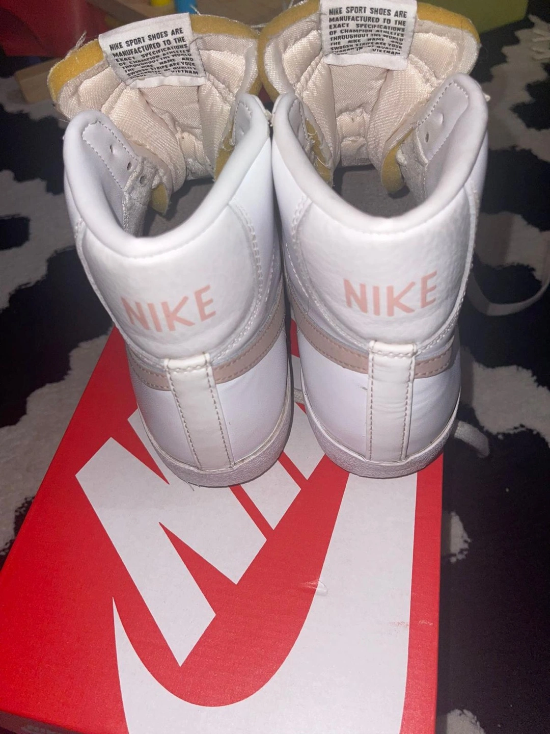 95Selling a pair of Nike Blazer Mid '77 high top sneakers. They are white with a pink swoosh. They come with the original box. Please see photos for condition.