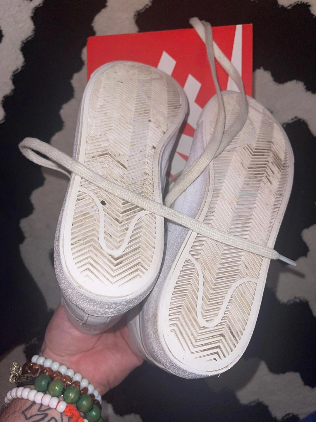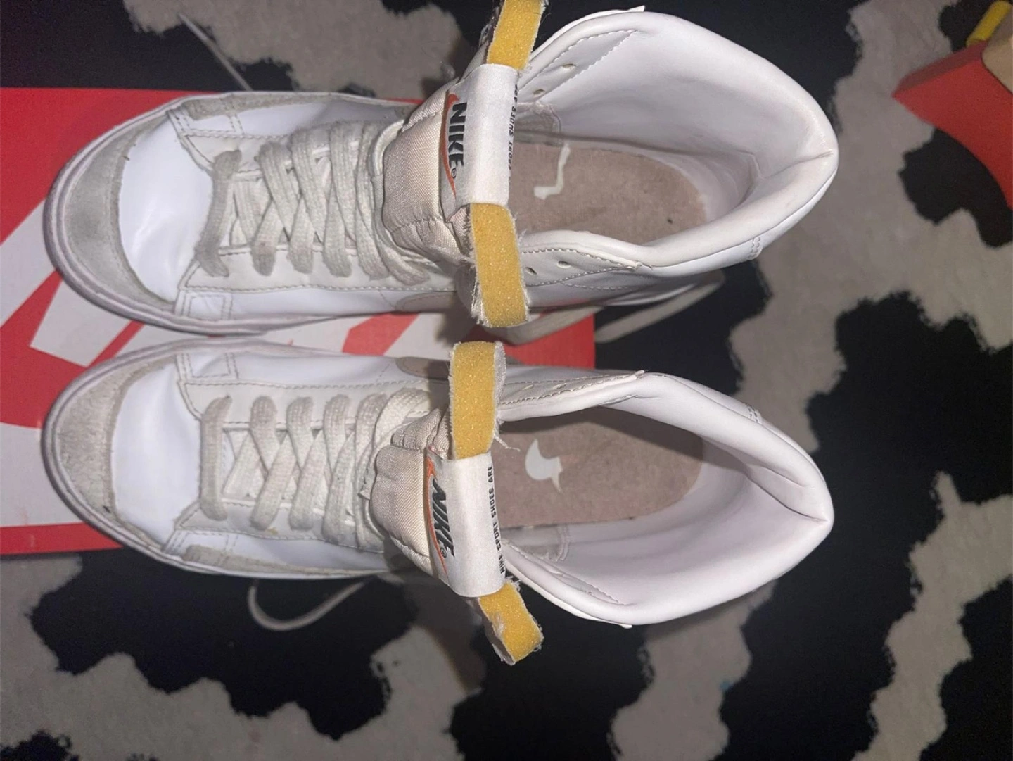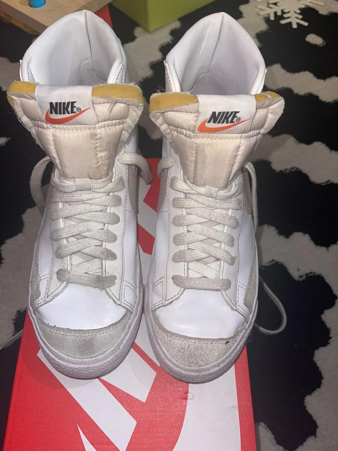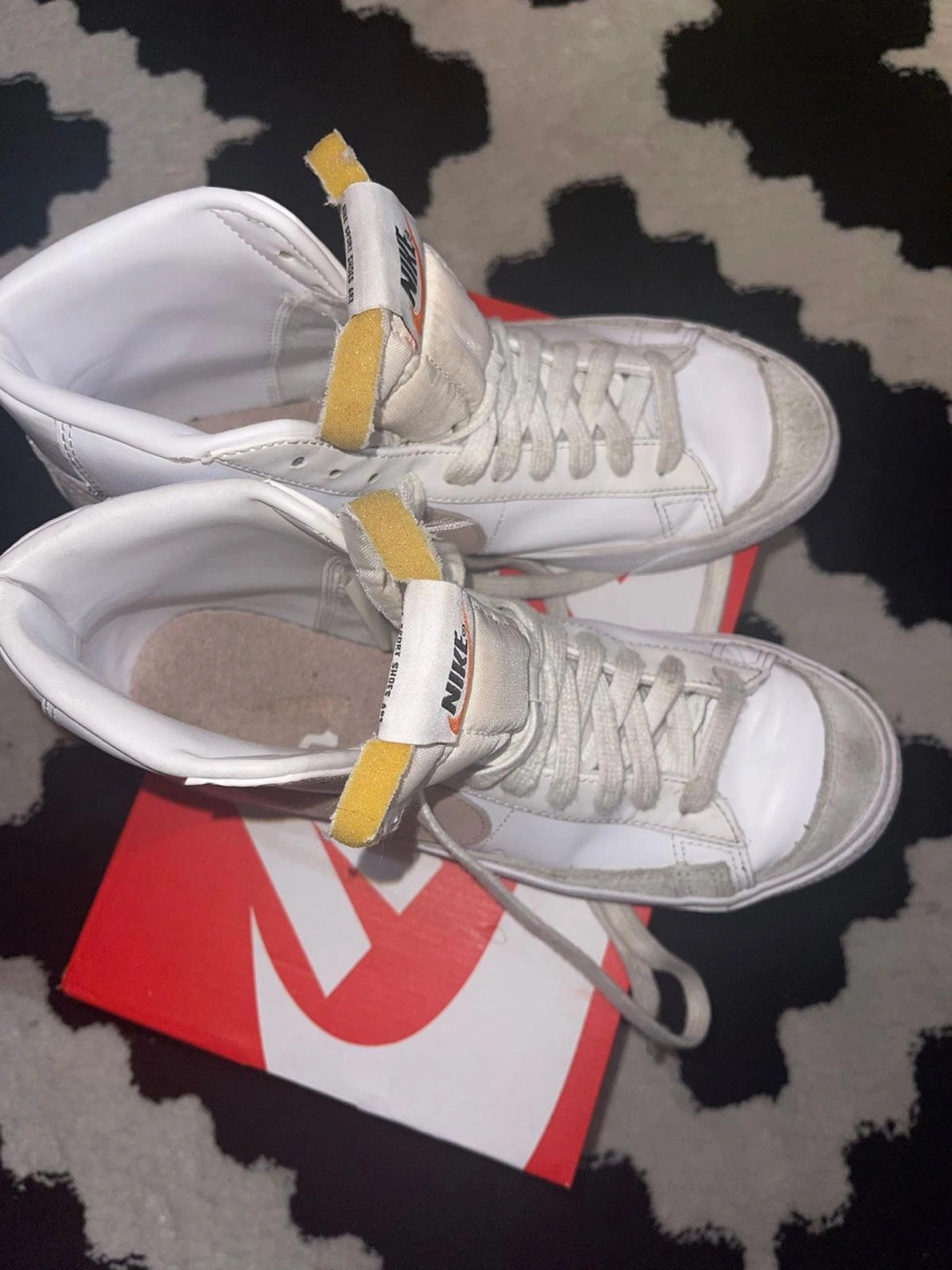 95Selling a pair of Nike Blazer Mid '77 high top sneakers. They are white with a pink swoosh. They come with the original box. Please see photos for condition.