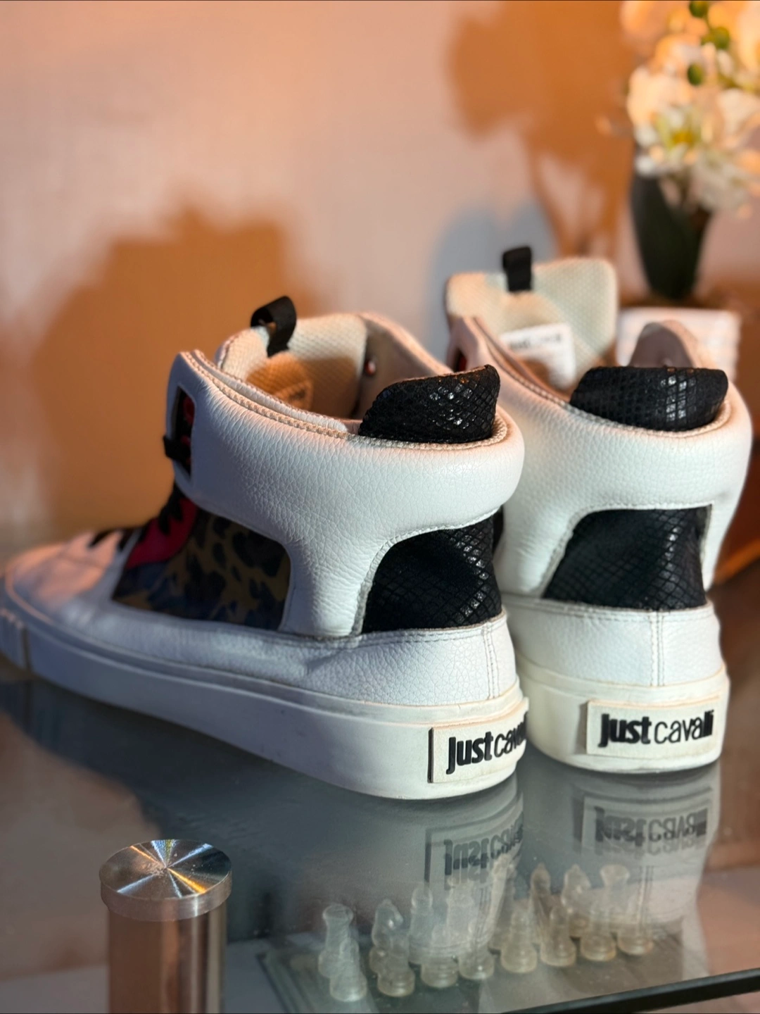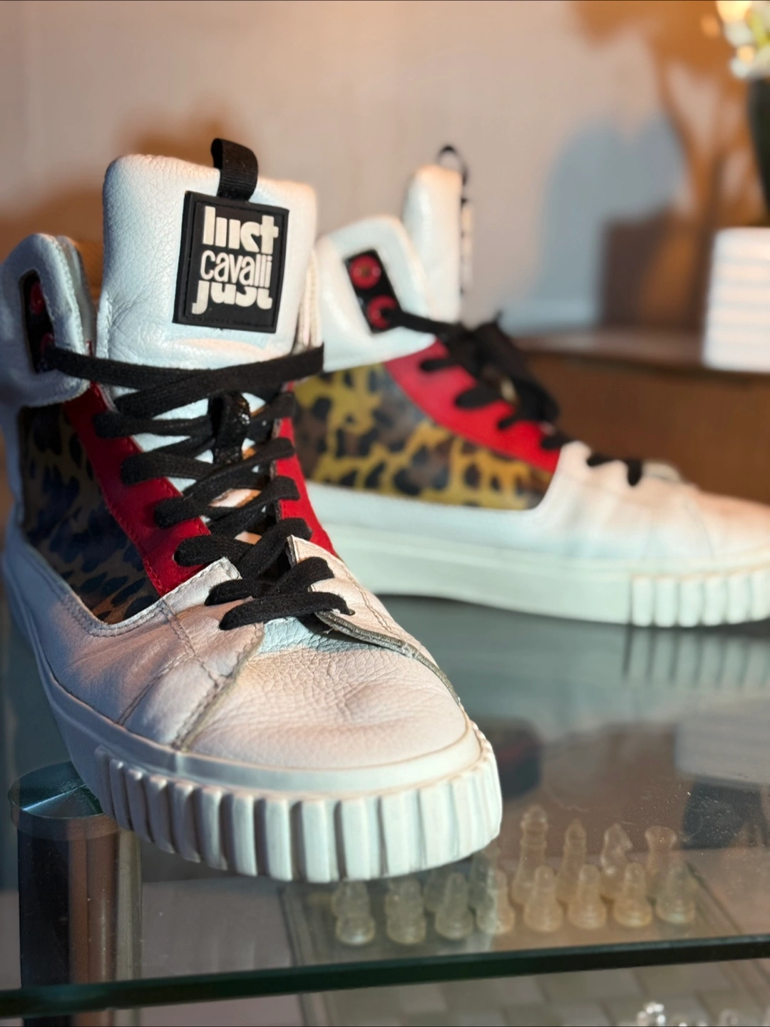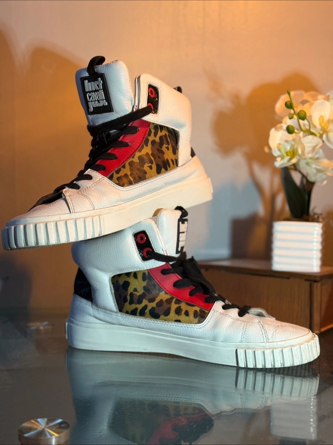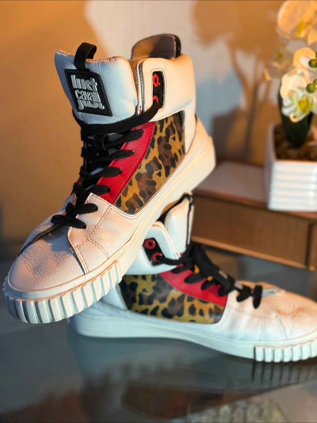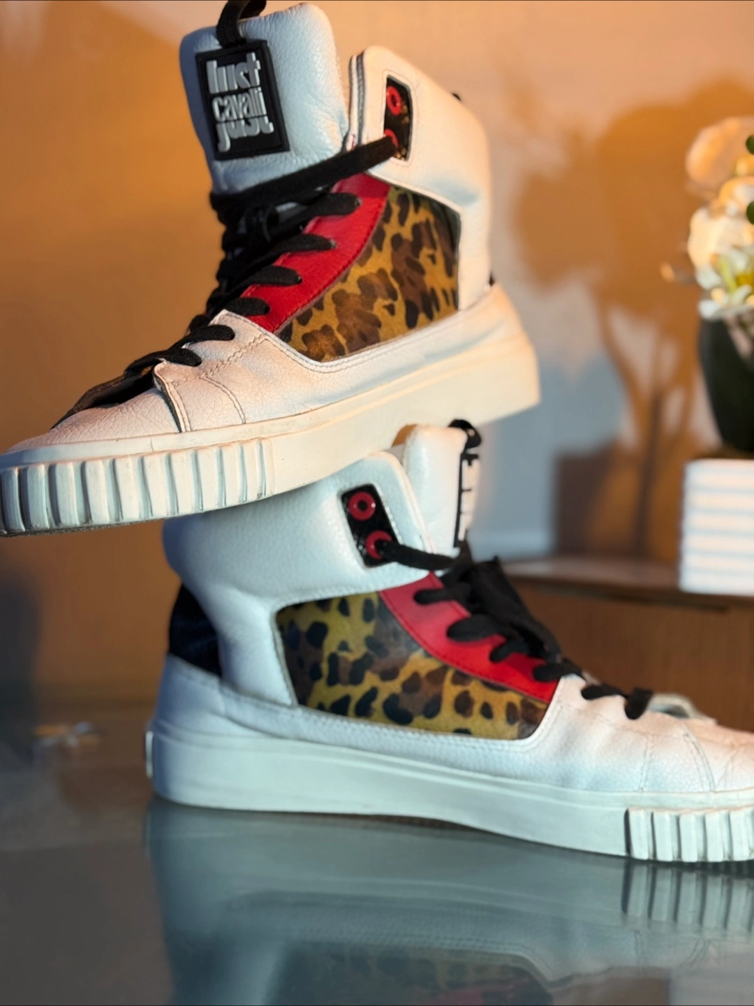 Up for sale are these stylish Just Cavalli high-top sneakers! They feature a unique design with white leather, red accents, and a fun leopard print panel. Perfect for adding a touch of flair to your wardrobe!