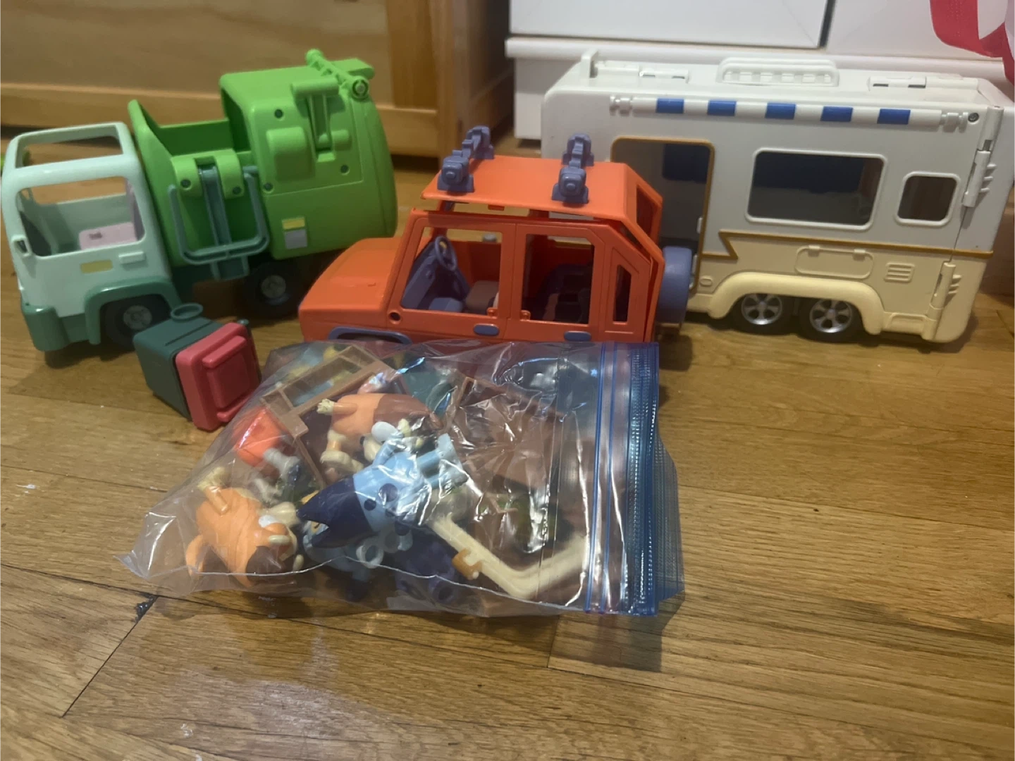 65Selling a set of Bluey toys! Includes a green truck, orange car, and a camper. Also comes with a bag of Bluey figurines. Great for any Bluey fan!