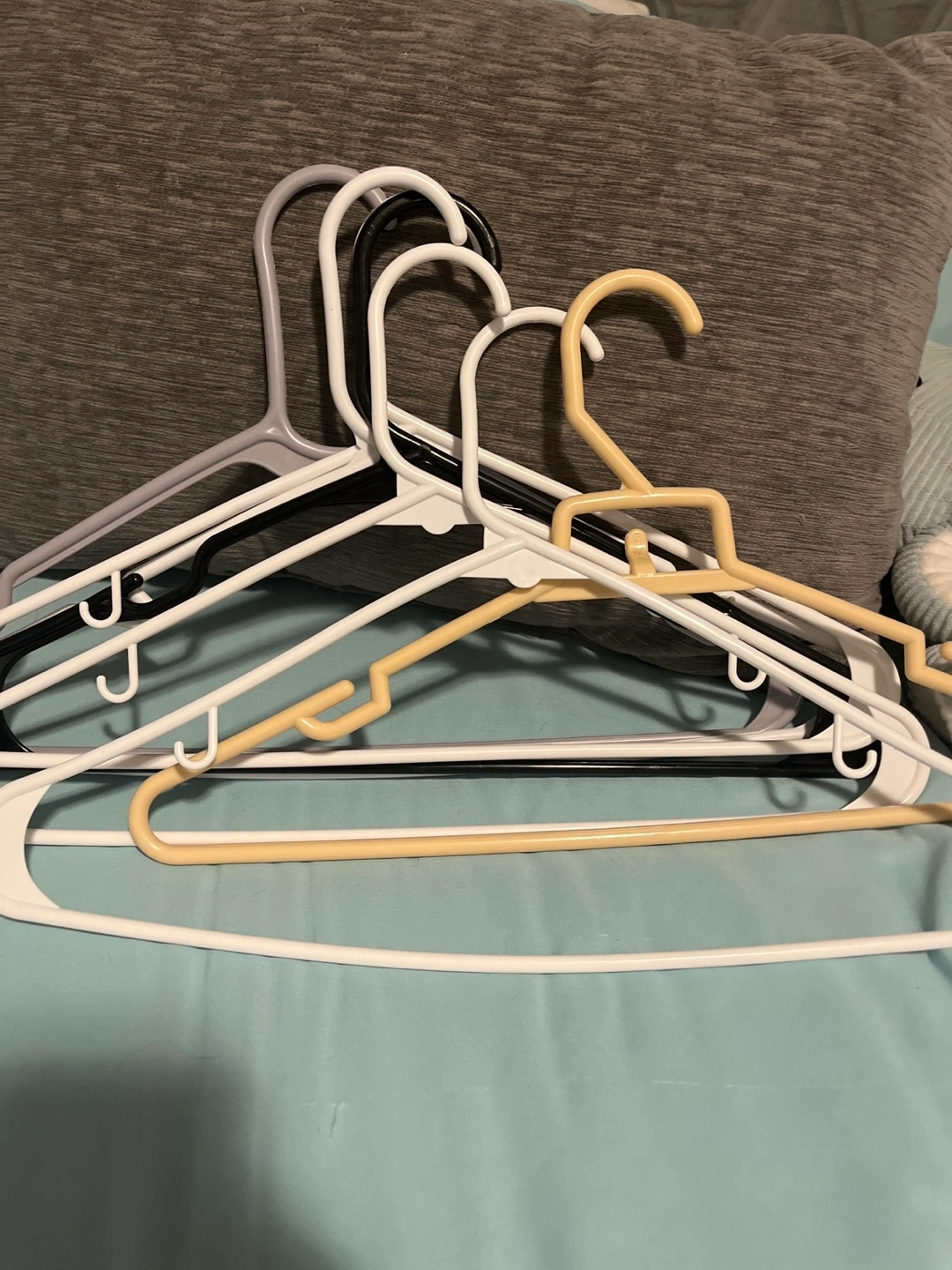 Giving away a set of clothes hangers in various colors including white, black, gray, and tan. They are in good condition and ready to help organize your closet!