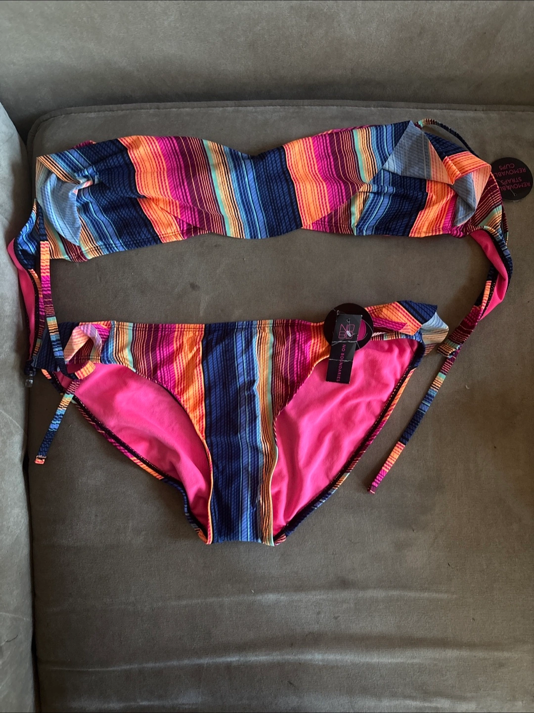 This is a cute No Boundaries bikini set with a colorful striped pattern! It includes both the top and bottom, perfect for summer . Size Large