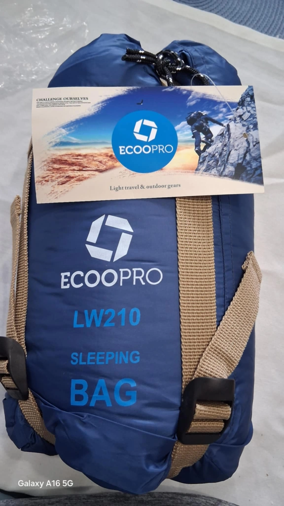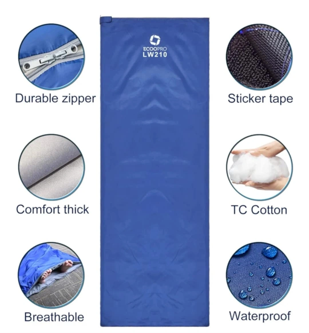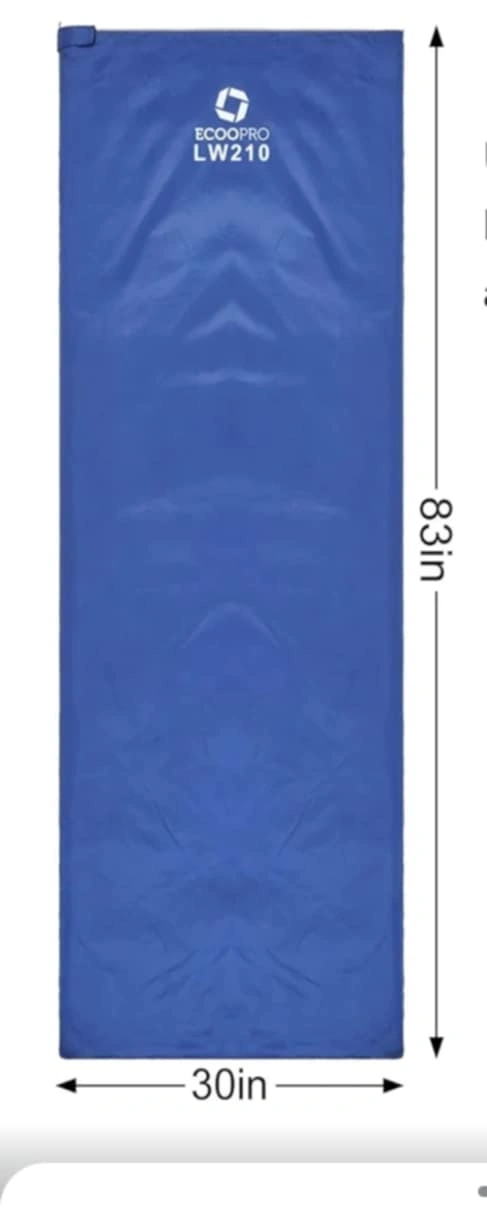 Here's a blue ECOOPRO LW210 sleeping pad! It features a durable zipper and sticker tape. It's also comfort thick, breathable, waterproof, and made with TC cotton
