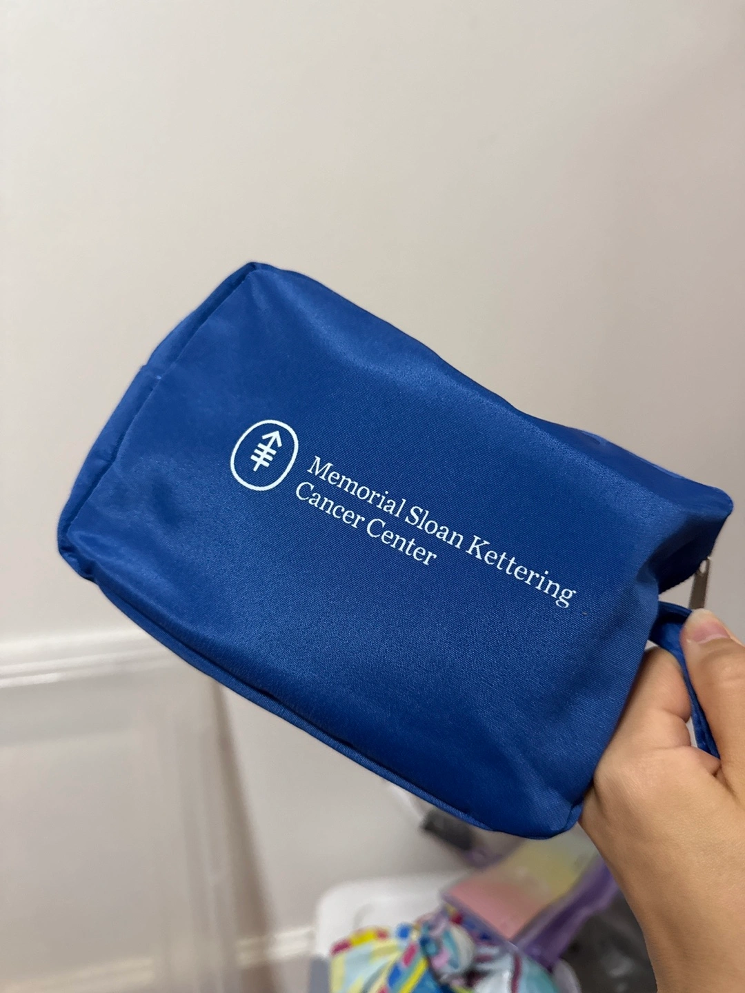 Here's a blue tote bag from Memorial Sloan Kettering Cancer Center. It's in great condition and perfect for carrying your essentials.