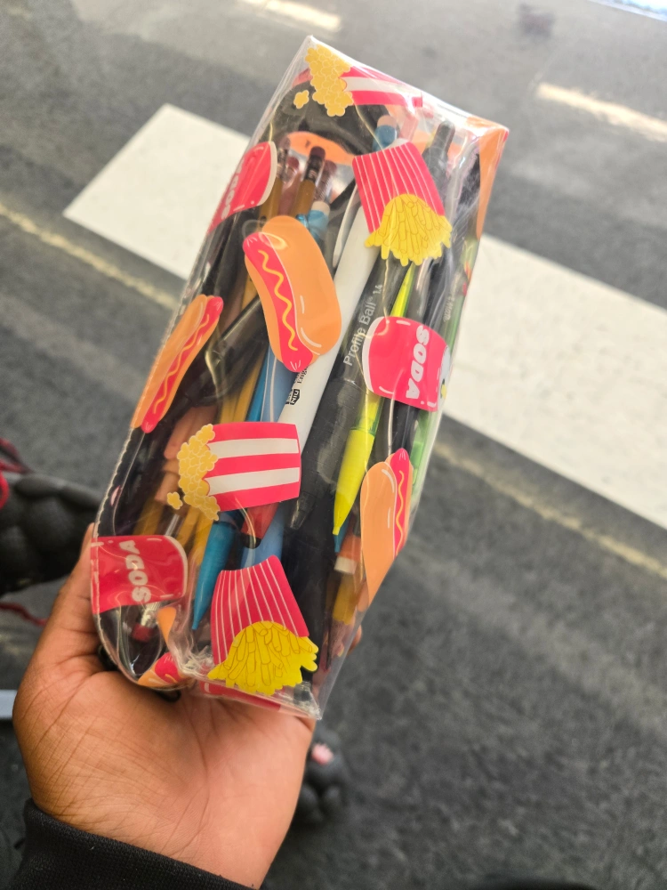 74Here's a set of pencils and pens in a fun, decorated pouch! It's got a playful design with hotdogs, fries, and soda. Perfect for school or office use