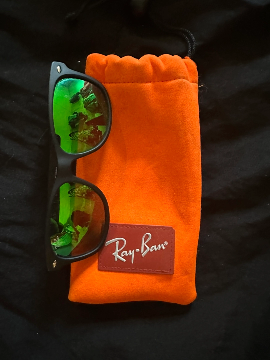 Selling a pair of classic kids Ray-Ban Wayfarer sunglasses in black! They come with the original Ray-Ban case to keep them protected. These are in great condition and ready for a new owner to enjoy!
