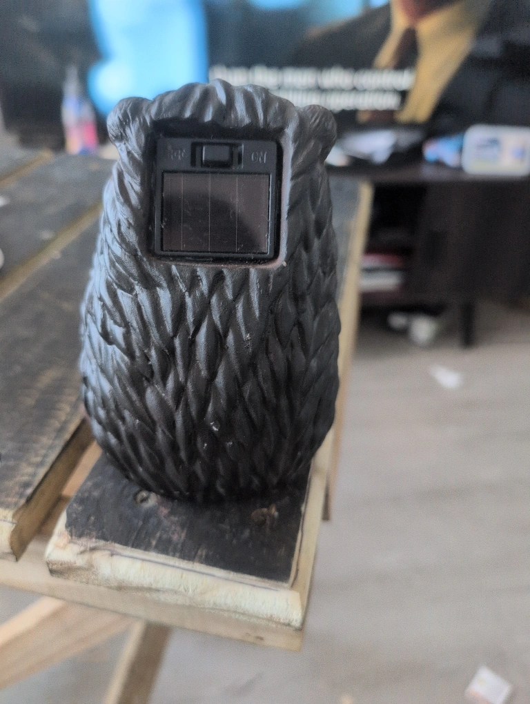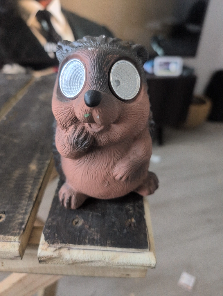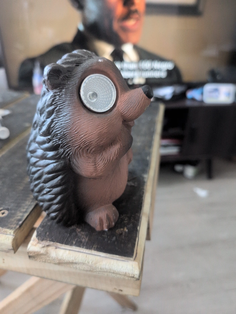 Here's a cute hedgehog solar garden light! It's perfect for adding a touch of whimsy to your outdoor space. It has a solar panel on the back to charge during the day and automatically lights up at night. It's in good condition and ready to brighten up your garden