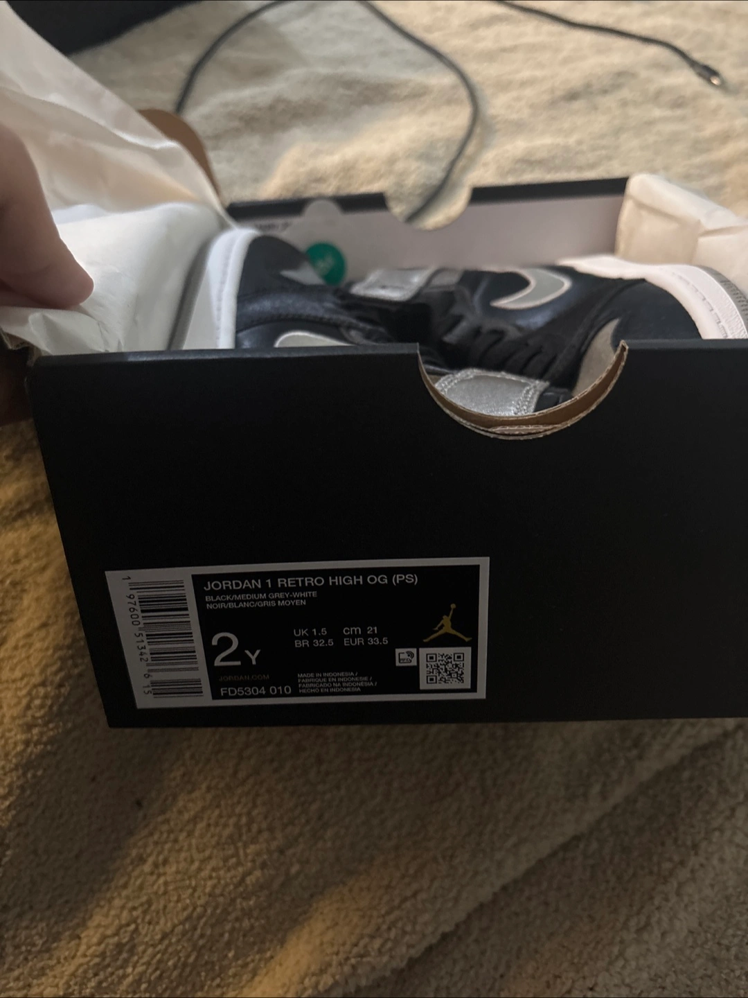 127Selling a pair of Jordan 1 Retro High OG (PS) in Black/Medium Grey. They are size 2Y. The box is included!