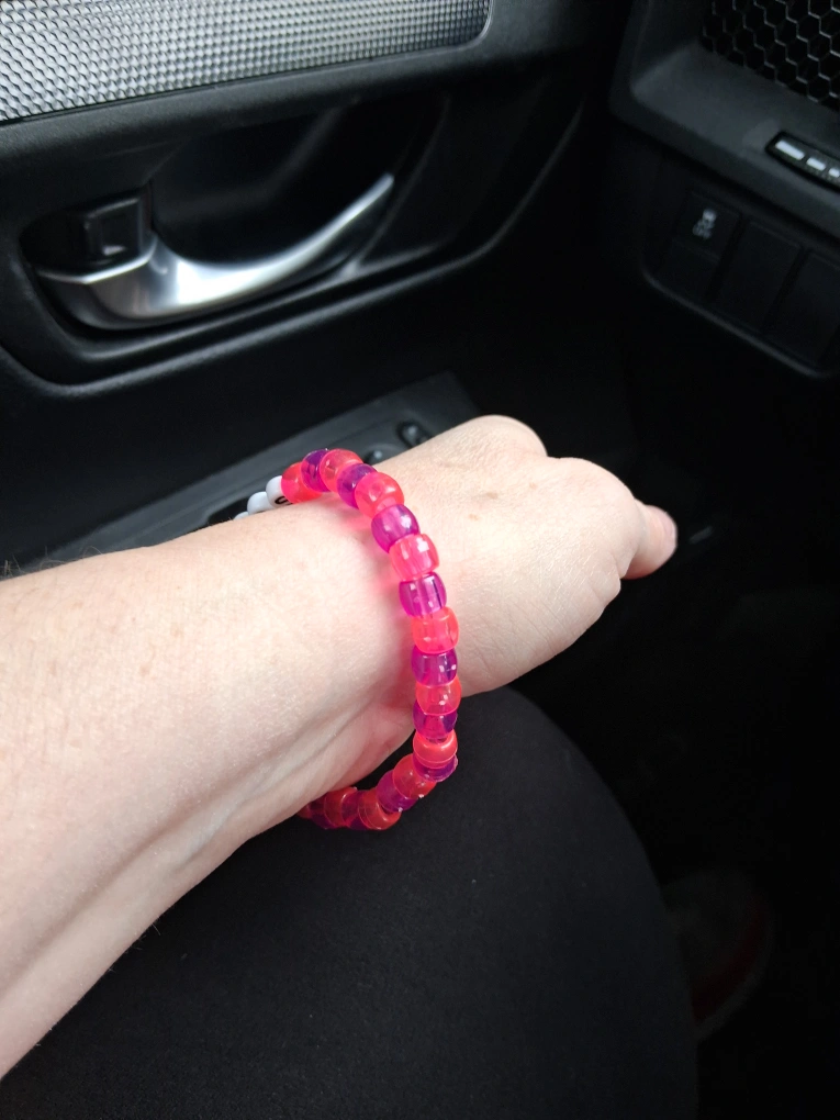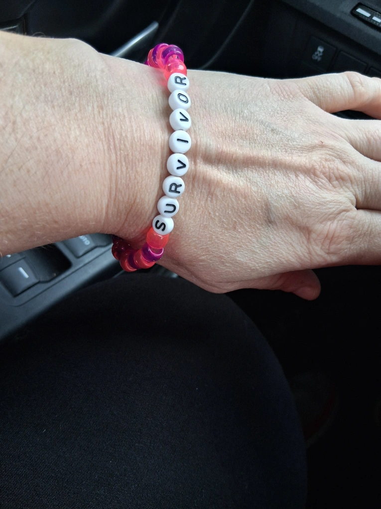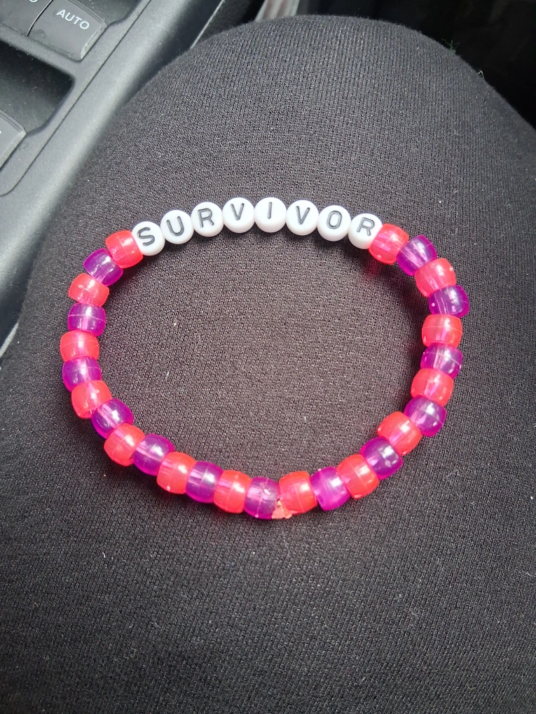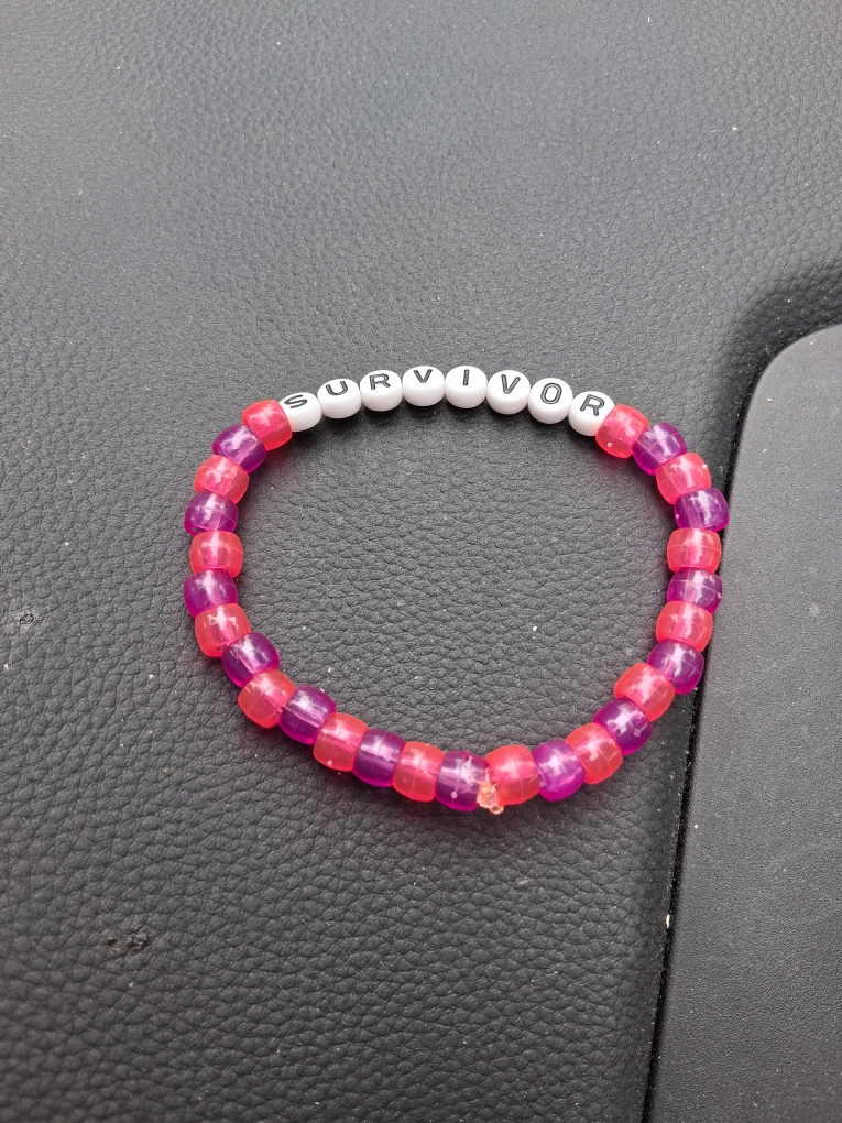 Selling 1 cute beaded bracelet with the word 'Survivor' spelled out in white beads. Breast Cancer bead colors! The bracelet is made of pink and purple translucent beads. Handmade by me! The final cost is $15 located in Fair Lawn NJ 07410 Thanks for checking out my post I look forward to speaking to you soon!