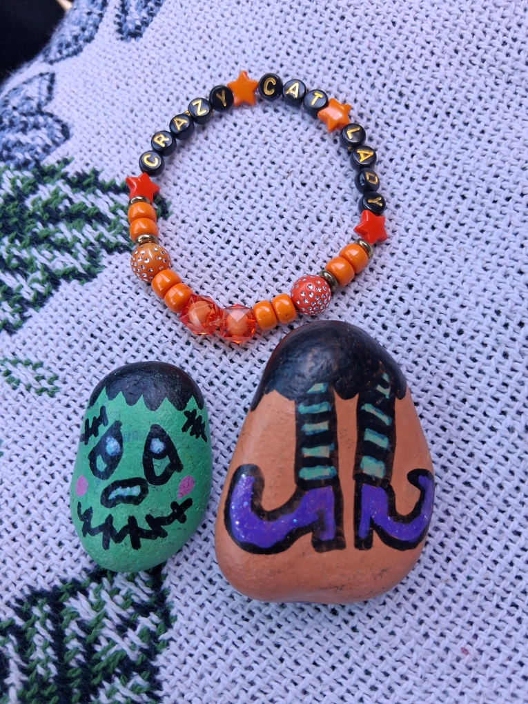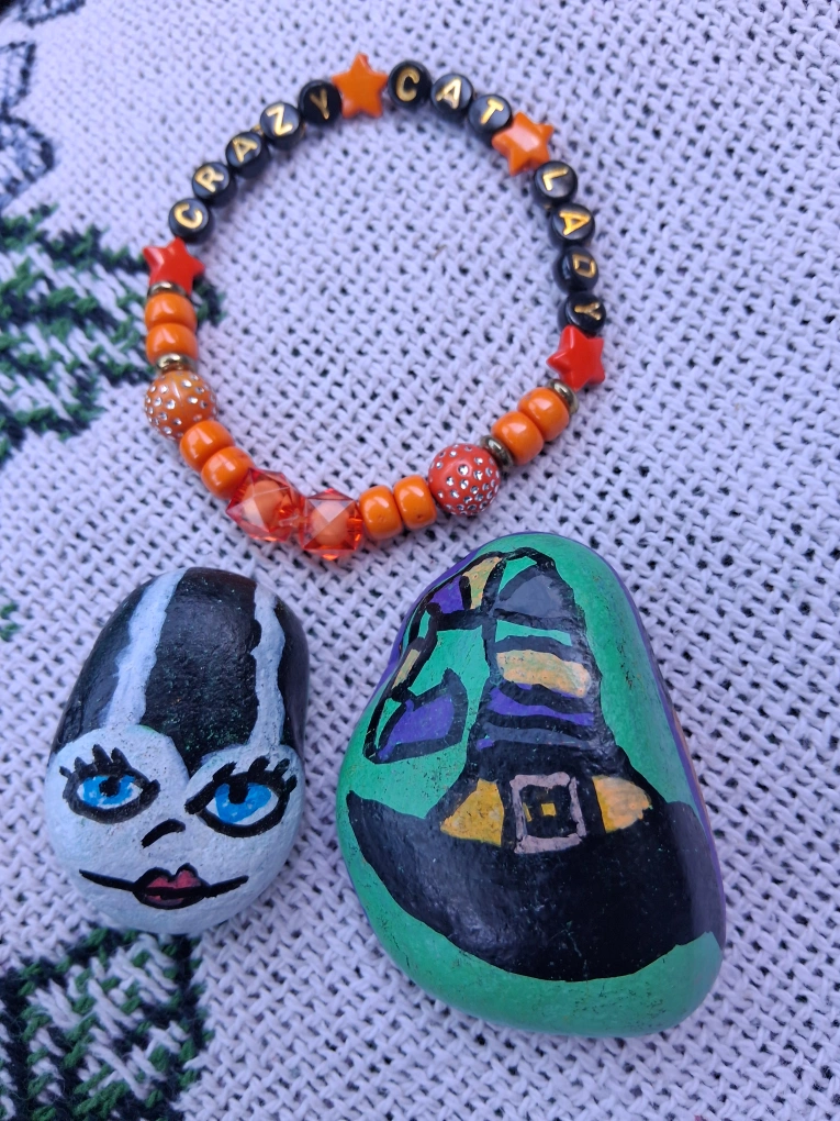 Cute handmade (by me) Halloween painted rock and Halloween themed bracelet! The bracelet says 'Crazy Cat Lady' and the rock is painted with Halloween themes. Price for Rock is $10 with a double sided design as seen in pictures. Halloween inspired bracelet is $10 price for both rock and bracelet is $20 Located in Fair Lawn NJ, CASH ONLY.
