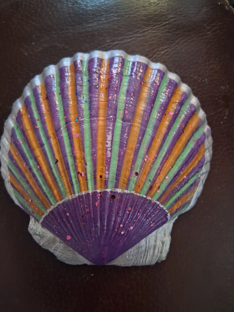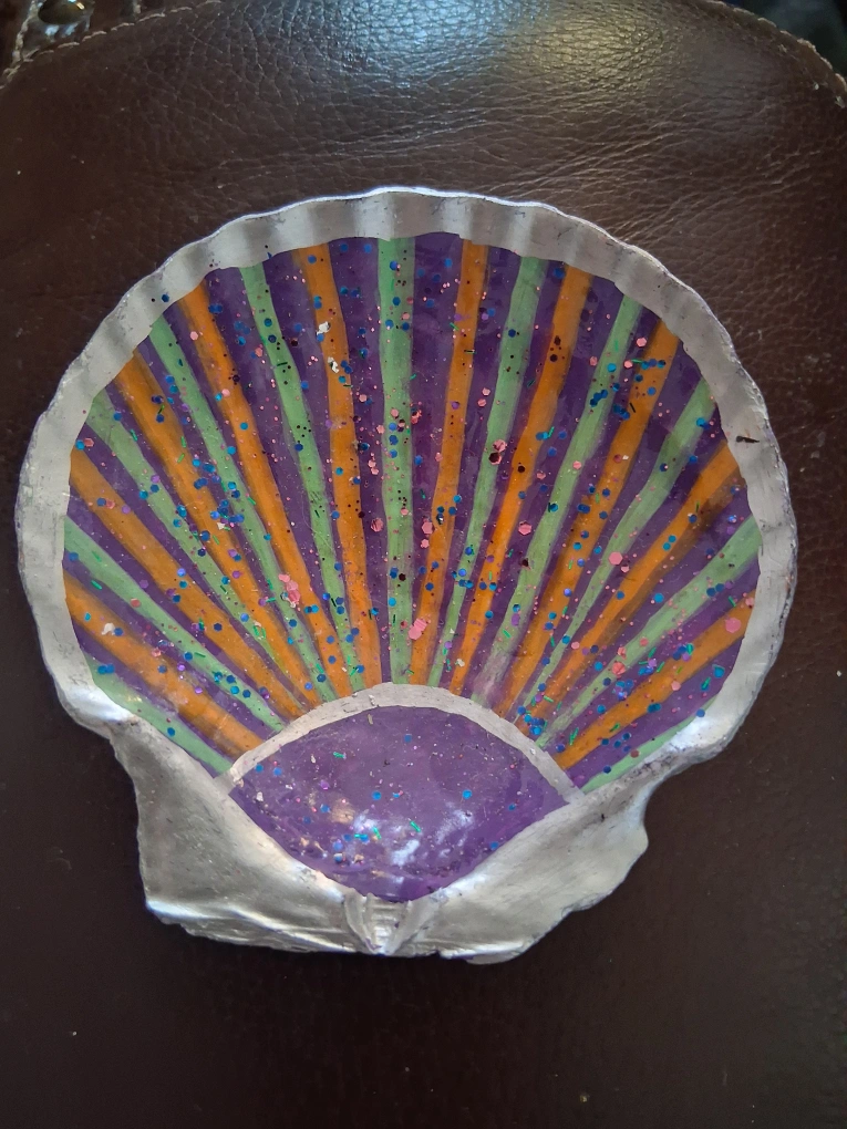 This is a hand-painted seashell dish! It features stripes in green, orange, and purple, with a glittery finish. Perfect for adding a touch of whimsy to your decor. Price is $15 Located in Fair Lawn NJ 07410 Size is 4 inches in circumference. CASH ONLY! Thank you for checking out my post. I look forward to hearing from you soon!