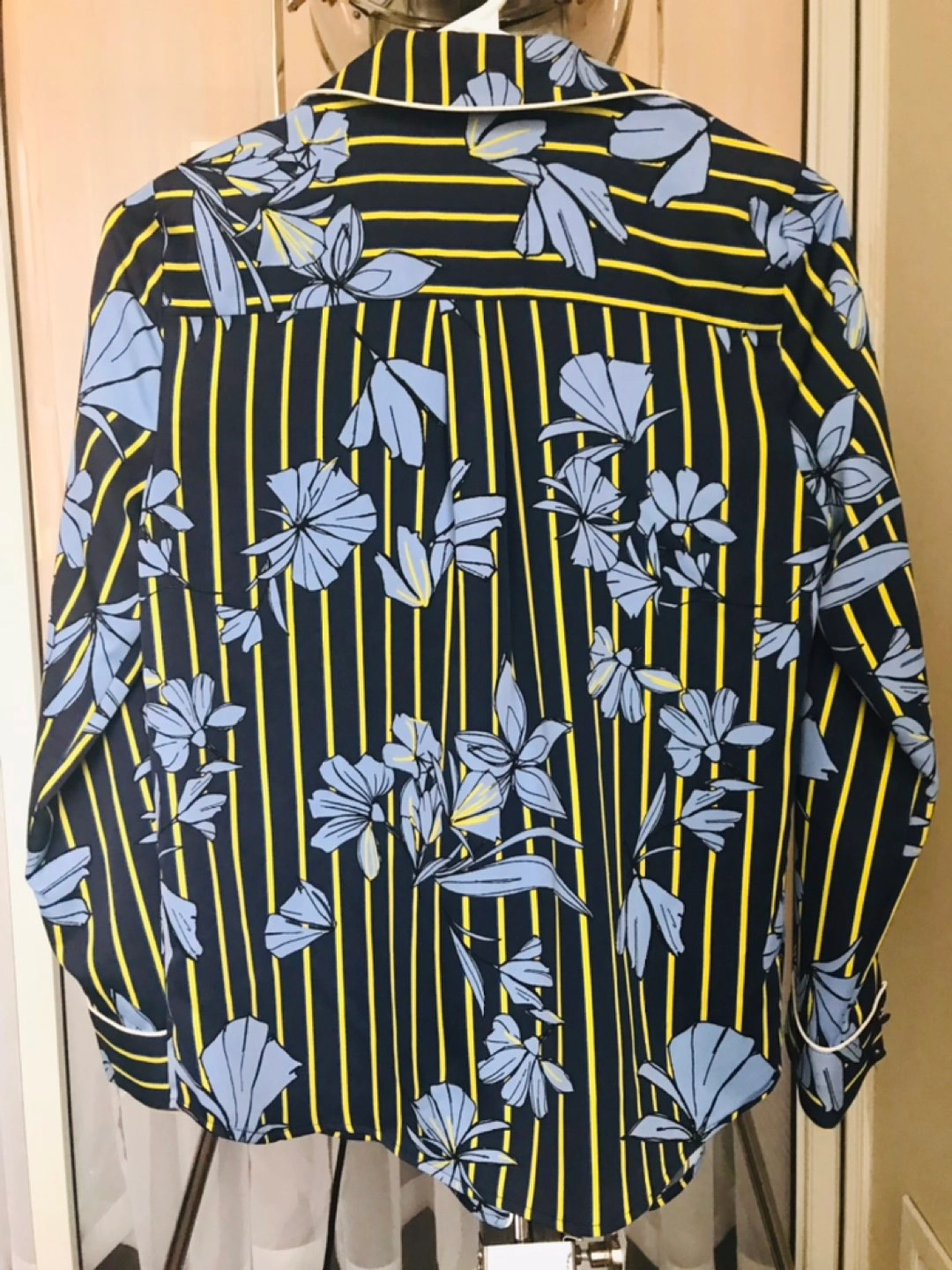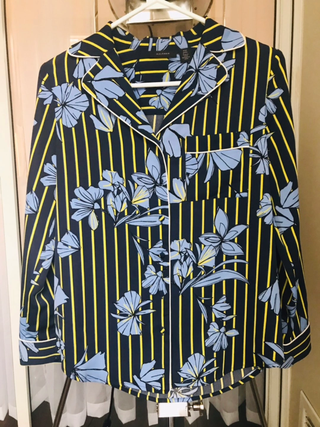 Nordstrom in-house Halogen label Women’s pyjama style button down blouse, navy with periwinkle floral pattern and yellow stripes with white piping, front pocket, never worn , size XS