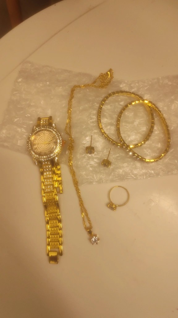 Selling a beautiful gold tone jewelry set! It includes a watch, a necklace with a pendant, a pair of earrings, a ring, and two bangles. Perfect for adding a touch of sparkle to any outfit
